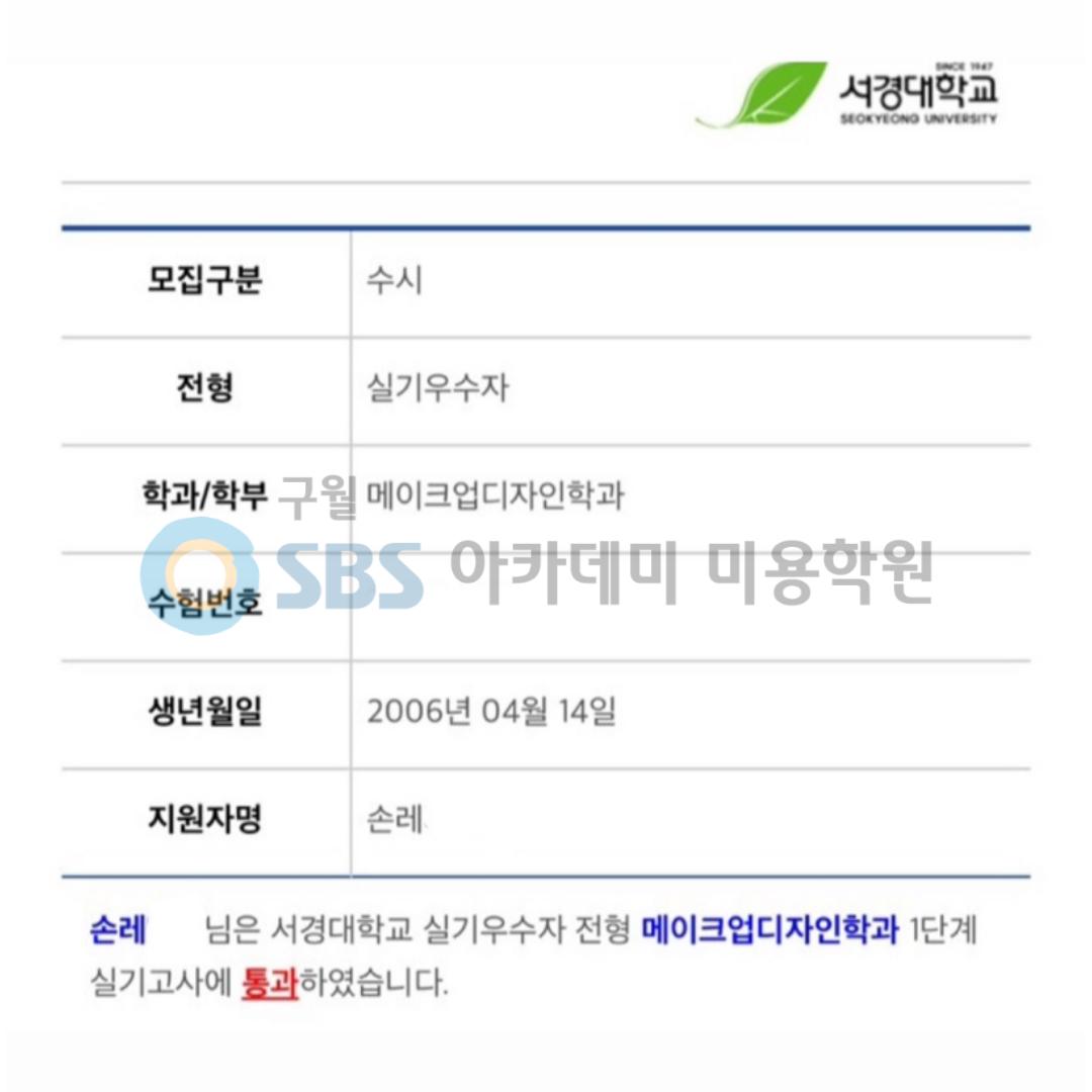 안녕하세요! 구월SBS아카데미미용학원입니다. 이번 서경대학교 미용예술대학 실기고사 1단계 합격자가 발표되었는데요! 열심히 고생하며 준비했던 구월캠퍼스 수강생분들..! 작년에 이어 올해에도 실기 1단계 합격자가 배출되었습니다^^ 지난주 주말에 2단계 실기까지 무사히 응시하여 최종합격자 발표까지 한달정도 남았네요 :) 열심히한만큼 좋은 결과있길 바랍니다! T. 032)434-0630