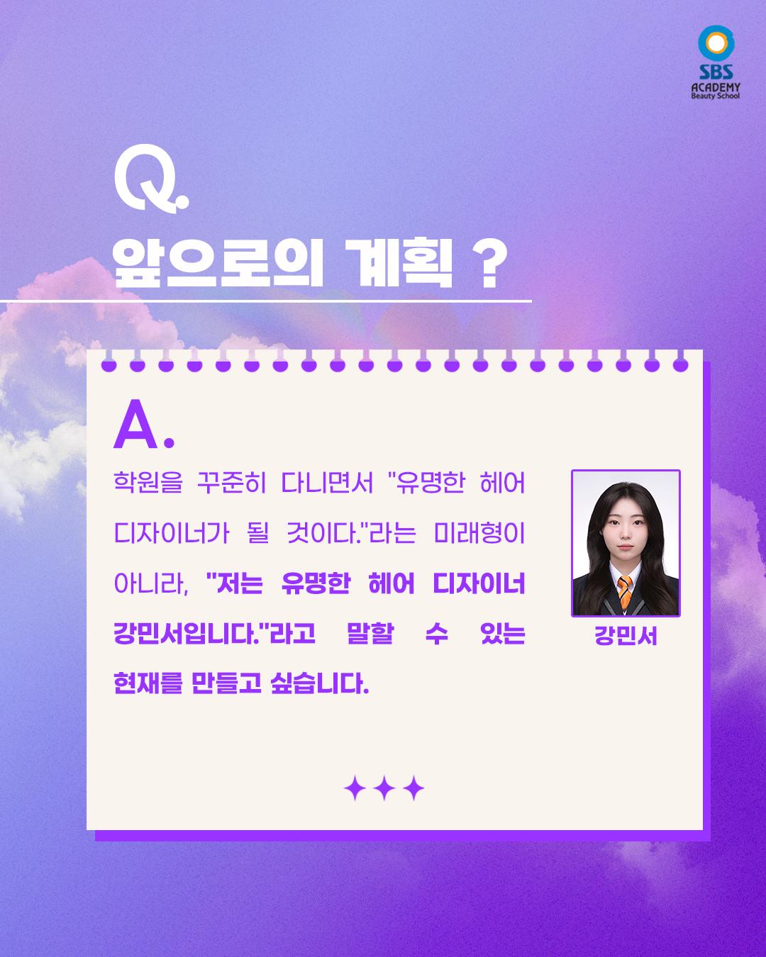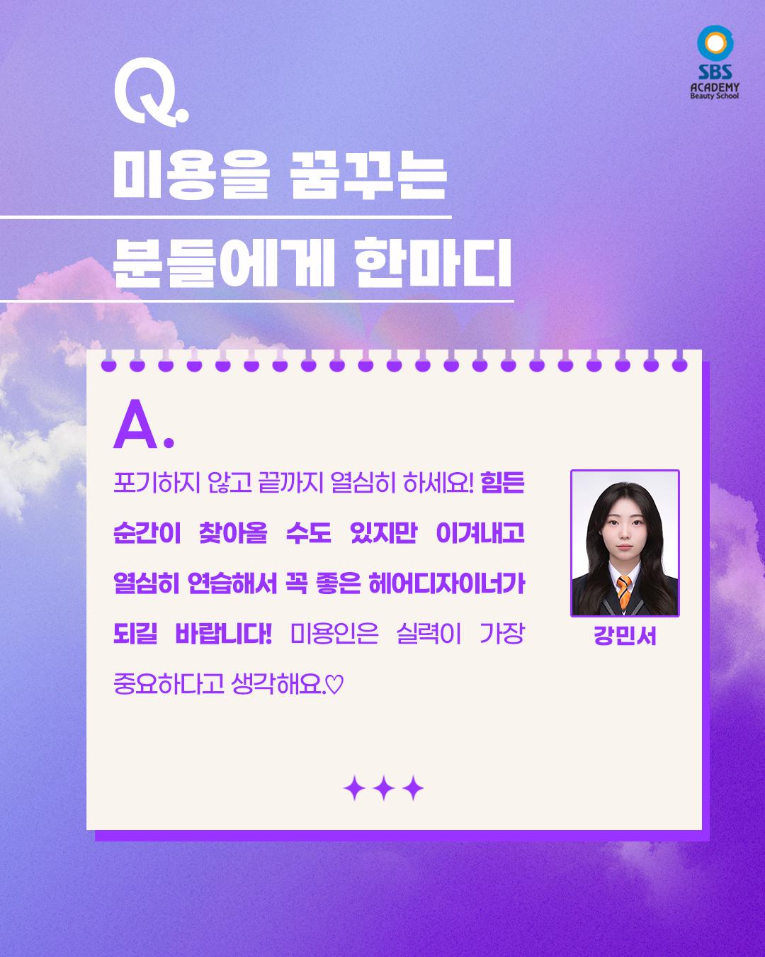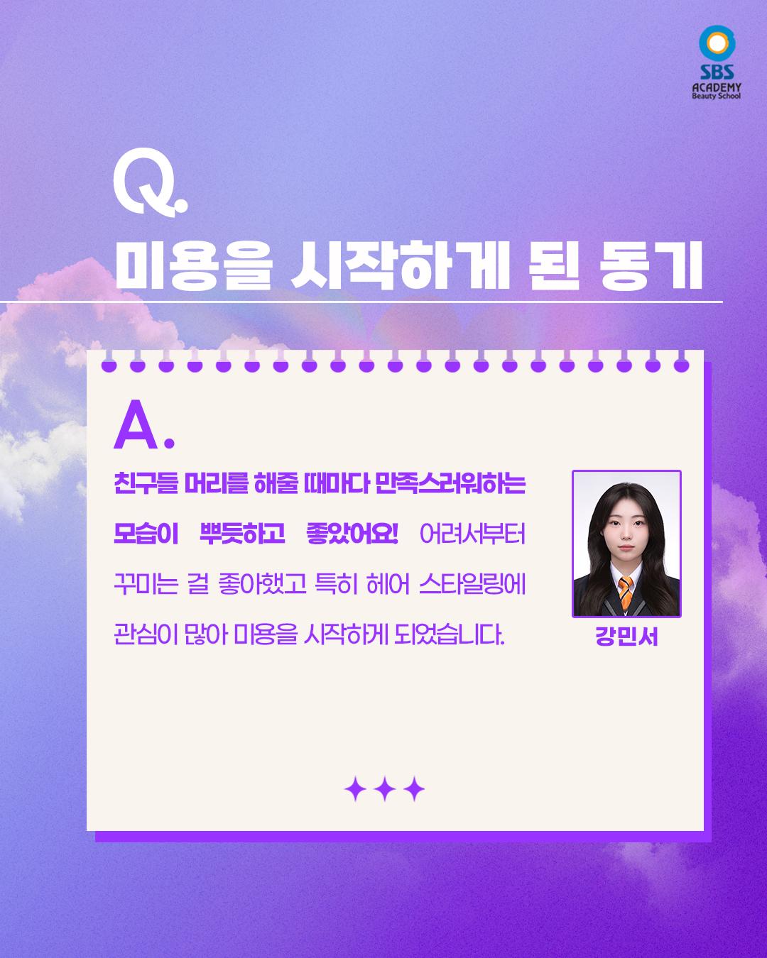 안녕하세요, 구월SBS아카데미미용학원입니다. 현재 구월캠퍼스에 헤어 진학 과정 수강 중인 강민서 수강생의 인터뷰를 가지고 왔습니다! 미용을 시작하게 된 이유부터 학원을 선택하게 된 계기, 그리고 수업을 들으며 느낀 점까지💜 한 명의 수강생이 진로를 만들어가는 과정은 결코 가볍지 않은 선택이기에 더 의미가 있는 것 같아요. 앞으로 자신의 이름을 당당하게 말할 수 있는 유명한 디자이너가 되는 그 날까지 구월캠퍼스와 함께 화이팅해보아요✨ ▶SBS아카데미미용학원 구월/부평/논현/서구/부천/김포/송도지점 수강문의 T. 032-434-0630