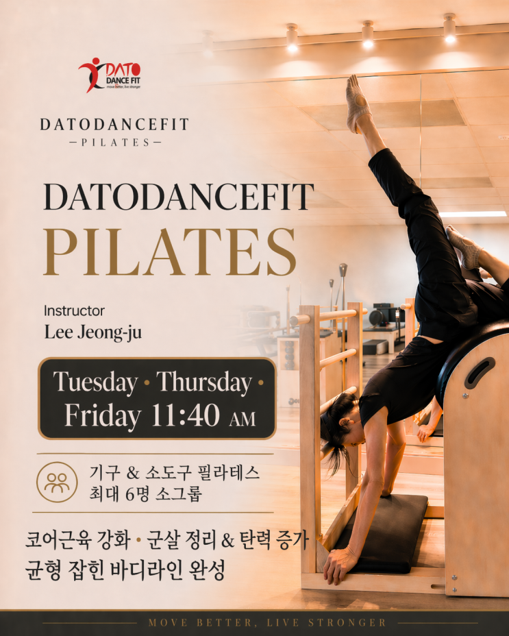 다토댄스핏의 새로운 필라테스 강사, 정주 강사님을 소개합니다. 4월 28일부터 새로운 강사님과 함께 매주 화·목·금 오전 11시 40분다토댄스핏에서 기구 & 소도구 필라테스 소그룹 클래스가 시작됩니다. 새로운 강사님은 미국에서 오랜 기간 필라테스를 지도해온 베테랑 강사로, 풍부한 경험과 전문성을 바탕으로 회원 한 분 한 분의 몸 상태에 맞춘 안전하고 섬세한 소그룹 수업으로, 편안하고 친근한 분위기 속에서, 회원님의 몸을 가족처럼 세심하게 살피며, 약해진 근력과 유연성을 향상시키고 바른 자세와 균형 잡힌 바디라인을 만들어 드릴 예정입니다 안녕하세요. 필라테스 강사 이정주 강사입니다. 회원님 한 분 한 분의 몸에 맞는 안....... <img src="https://blogthumb.pstatic.net/MjAyNjA0MjRfMiAg/MDAxNzc3MDQwODAwNzM0.oLhK-rfcRpofIdVlEK-4J3hJbp3IRadCTPIVcsuQ1UQg.Tj6hgS8J3zihXq_X8gWYIfUE3XhCLm_BidLRH879raAg.PNG/12c161ba-d1ec-4c5e-bdc1-7fa4a04e3cf6_%281%29.png?type=s3" />