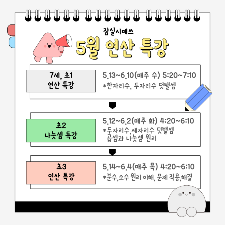 연산 개념을 통해 연산 실력을 향상시키고 자심감을 얻을 수 있도록 잠실시매쓰에서 5월 연산특강을 개강합니다. 7세 , 초1 연산 특강 5/13(수)~6/10(수) 5:20~7:10 주 1회 총 4회 - 내용 : 한자리수, 두자리수 덧셈, 뺄셈 초2 연산 특강 5/12(화)~6/2(화) 4:20~6:10 주 1회 총 4회 - 내용 : 두자리수, 세자리수 덧셈,뺄셈, 곱셈과 나눗셈 원리 초3 연산 특강 5/14(목)~6/4(목) 4:20~6:10 주 1회 총 4회 - 내용 : 분수, 소수의 이해 , 문제 적용, 해결 <수업 구성 및 공지 사항> +각 반 8명 정원, 선착순 마감+ +교구를 통해 개념을 익히고, 문제 해결 진행 +결석에 대한 보강 진행 X+ 신청 https://pf.kakao.com/_pxcxaEK <img src="https://blogthumb.pstatic.net/MjAyNjA0MjNfMTMy/MDAxNzc2OTIxOTMyMTM1.BjxeRT8EadLWdhopsZZjXRGuTt0zGPMLY-pfl4Qz960g.OlC44zeCvUVCLwBjucv3h9Nvvv-QE4TBYTh0-1NNVnMg.PNG/%C1%A6%B8%F1%C0%BB_%C0%D4%B7%C2%C7%D8%C1%D6%BC%BC%BF%E4._-_2026-04-23T142500.092.png?type=s3" />