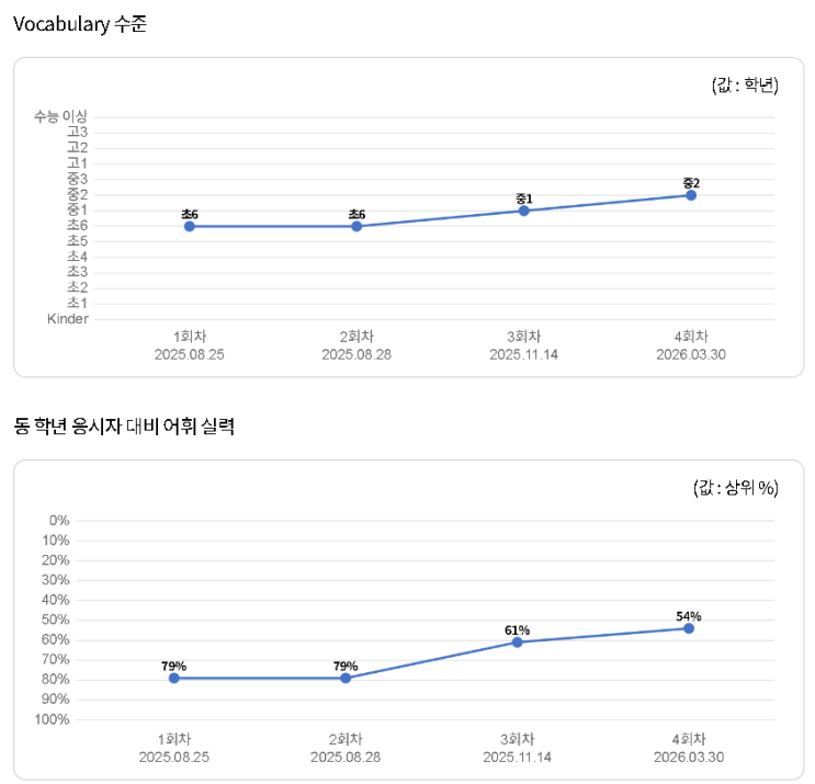 학부모님과 학생 여러분, 안녕하세요! 수능/내신 영어 1등급 대치탑영어학원입니다! 오늘도 실제 학생의 성취도 통계적 자료를 통해 '어휘와 문법 학습의 중요성'을 객관적으로 보여드리고자 합니다. 지난 02편에서 2주간의 몰입이 주는 변화를 보여드렸다면, 오늘은 조금 더 냉정하고 현실적인 7개월간의 장기 데이터를 공유하려 합니다. C학생은 학기 중에는 꾸준히 대치탑영어학원의 시스템을 따라왔지만, 지난 방학 2달간 여행과 휴식으로 학습 공백기를 가졌습니다. 그 7개월간의 누적 데이터는 우리에게 중요한 메시지를 던집니다. 1. 어휘력: 초6 수준에서 중2 수준으로 점프 2025년 8월 25일: 상위 79% (초6 수준) 2026년 3월....... <img src="https://blogthumb.pstatic.net/MjAyNjA0MjBfNTYg/MDAxNzc2NjgxNDY0MTkz.rU-ZDSyikOlS7BtOKumuqhG9nnQutMu1baaQ2YHIEuwg.XeWYiKm-U7Xh5Bw7nOiYtuwx44b1JUg32GbpuivzuNYg.PNG/20260417155022_LJE_%B4%A9%C0%FB_9_10%BF%F9%B3%BB%BD%C5%C1%FD%C1%DF_92%C1%A1%C0%CC%BB%F3_%B9%E6%C7%D02%B4%DE%BF%A9%C7%E0%2B%C8%B8%BA%B9_____________%BE%EE%B9%FD%2B%C3%DF%B0%A1%C7%CA.png?type=s3" />