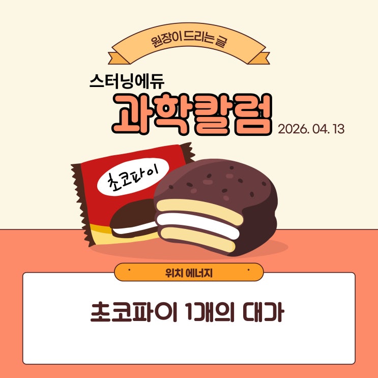 2026.04.13. 원장이 드리는 글 초코파이 1개의 대가 수업 중 학생의 질문 하나. “선생님, 계단 오르기는 몇 칼로리 소비돼죠?” 그 질문 하나로, 그날 수업은 조금 특별해진 적이 있습니다. 집에서 지금 고등학교 과학교사로 일하고 있는 아내와 두 아들 앞에서 이야기를 이어갔습니다. 가볍게 웃으며 시작한 계산 과정은 생각보다 재밌었습니다. 우선 중력가속도 10m/s², 아파트 한 층 높이 3m로 잡고 10층을 오른다고 가정, 제 몸무게 70kg을 기준으로 하면, 제가 만들어낸 위치에너지는 다음과 같습니다. mgh = 70 × 10 × 30 = 21000J 이제 이것을 1cal = 4.2J를 적용하여 칼로리로 바꾸면, 대략 5000cal, 즉 5kcal 정도가 됩....... <img src="https://blogthumb.pstatic.net/MjAyNjA0MTRfNzIg/MDAxNzc2MTY2OTU1MDg1.v0N2TZXmxVNWruGso4Q9YZqTWmCDD-fi_81Yd9PiHgcg.-YfGhOVSR7X-NaGGxToILGx2AyP9vCsiwSNuesY7YOog.JPEG/1.jpg?type=s3" />