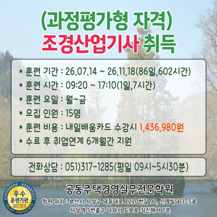 교육청 등록번호 제1806호 안녕하세요 공동주택경영실무전문학원입니다 오늘은 많은 분들이 기다리셨던 과정평가형 조경산업기사 개강 일정 안내드립니다 혹시나 과정평가형에 대해 모르시는 분들을 위해 간단히 설명드릴게요 ★검정형과 과정평가형 차이점★ 응시 자격 때문에 산업기사, 기사 도전을 망설이셨던 분들 주목! 이제 **'과정평가형 제도'**로 자격증 취득의 문을 활짝 열어보세요! "아직도 손으로 도면을 그리시나요?" 검정형 실기는 아직 수기 도면으로 시험을 보기도 하지만, 사실 요즘 현장에서 수기 도면 쓰는 곳은 거의 없죠. 저희 교육 과정은 컴퓨터를 활용한 도면 수업으로 진행됩니다! 이제 자와 샤프....... <img src="https://blogthumb.pstatic.net/MjAyNjA0MjRfMTQ4/MDAxNzc3MDE2NDc4OTY2.K6coM5aRB3i_c9BCfAbC3MhT0Oi8AdpHwgjpaq8ISKYg.4uBDOSADivMDUAqEkGSNleLZKfzLbZA5ZGDXlY94nckg.JPEG/%B0%FA%C6%F2_%C1%B6%B0%E6%B1%E2%BB%E7%2C_%BB%EA%BE%F7%B1%E2%BB%E7%2C_%BB%FD%C5%C2_2.jpg?type=s3" />