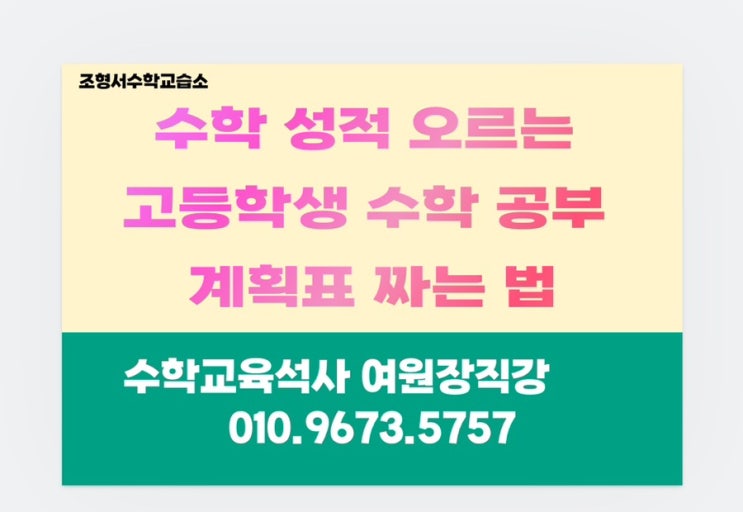 수학 성적 오르는 고등학생 수학 공부 계획표 짜는 법 안녕하세요 조형서수학입니다 새 학기, 새 마음으로 멋지게 수학 공부 계획표를 세웠지만 며칠 못 가서 무너진 경험, 다들 한 번쯤 있으시죠? 오늘은 의지력 탓은 그만두고, 진짜 내 성적을 올려줄 현실적인 고등학생 수학 공부 계획표 작성법을 단계별로 꼼꼼하게 알려드릴게요! ㅡ왜 내 수학 계획표는 항상 실패할까? 의욕이 앞서서 하루 공부 시간을 무리하게 잡거나, 문제집을 여러 권씩 계획에 구겨 넣은 적 있으신가요? 현실에는 학교 수업, 수행평가, 다른 과목 공부까지 변수가 참 많습니다. 계획이 밀리면 '나는 안 되나 봐' 하고 자책하게 됩니다. 하지만 이건 여러분의....... <img src="https://blogthumb.pstatic.net/MjAyNjA0MTJfMTk0/MDAxNzc1OTY4ODI1MDU1.K1fBXdIfXPdgHKScZq3l3uEt7yHoQZzRqQfN5PbuR0Ug.e5MJmFxPiLadYf2as9RL7ibgQo4rYQmOfSGWyJO7CBQg.JPEG/output%A3%DF1823276117.jpg?type=s3" />