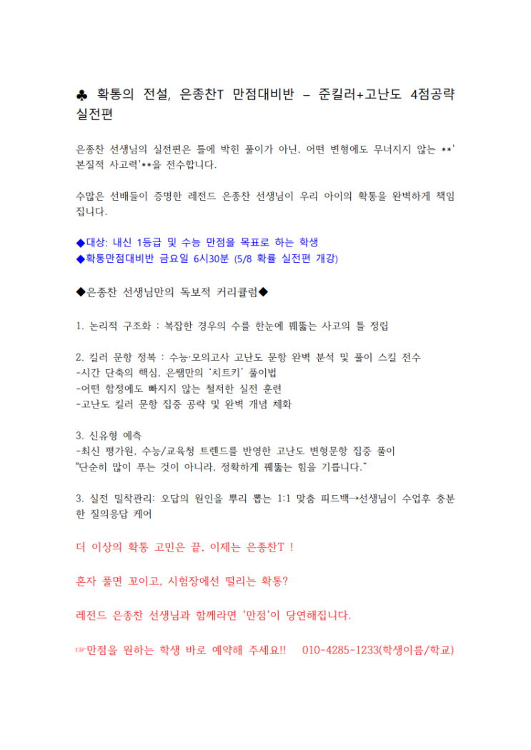 확통의 레전드 은종찬T 만점대비반(실전편)