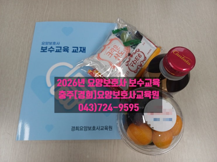 2026년 요양보호사 보수교육이 한달에 2번 토요일마다 진행되고 있습니다. 요양보호사 보수교육은 2년에 한번 현장에서 일을 하고 계신 요양보호사 선생님들께서는 꼭 들으셔야 하는 필수 의무 교육입니다. 올해는 생년의 뒷번호가 짝수이신 요양보호사 선생님들이 보수교육 신청하는 해 입니다. 올해도 어김없이 경희요양보호사교육원에서는 알찬강의로 준비했습니다. 현장에서 꼭 필요한 직무스트레스 관리와 응급상황 대처까지 심폐소생술은 물론 심장충격기 사용법까지 이론과 실기로 정확히 알려드립니다. 2026년 요양보호사 보수교육 신청 경희요양보호사교육원 043)724-9595 개별접수가능 단체접수환영 충주시 연수동 339번지 현대빌딩 4층....... <img src="https://blogthumb.pstatic.net/MjAyNjA0MDZfMjQg/MDAxNzc1NDQzMTM0NTcw.snABZSu1krl2m9pVVXLvJjL0HOZ2ccmCx_V3i4UmMmcg.wxjcuPF_6Bnfy6Oe8zOAoqfAJOCKVJYHhcXGDjyofeMg.JPEG/KakaoTalk_20260406_104458099.jpg?type=s3" />