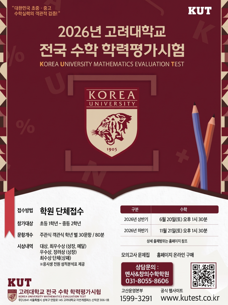 아이들의 객관적인 수학 실력을 점검하고 상위권으로 도약할 수 있는 좋은 기회로 2026년 상반기 고려대학교 전국 수학학력평가 접수와 대비 특강 안내를 합니다. KUT (약칭, 고려대학교 전국 수학 학력평가 시험)는 2012년 부터 실시된 고려대학교 전국 수학인증 시험을 모태로 2020년부터 새로운 형식으로 진행되는 전국 단위 초,중등 수학학력평가 시험 입니다. 고려대학교 경시대회는 지나친 심화 문제는 지양하며, 현행의 정확한 이해도와 심화를 알 수 있습니다 수학경시대회라는 이름만 들어도 가슴이 두근거리기도 하고, 한편으로는 '우리 아이가 너무 스트레스받지는 않을까?' 하는 걱정이 앞서기도 하시죠? 하지만 단순히 상....... <img src="https://blogthumb.pstatic.net/MjAyNjA0MjFfMTg3/MDAxNzc2NzQwOTA3MjY4.RvzB-u0VAmuhQXmlMKeQEEjtXhE1qTX3yiMvhe9LYwog.EFeyKbpwpNIIEJk3usC9HdZrjYMoQ5gcrFf_KKnEzEMg.PNG/Gemini_Generated_Image_nwec1cnwec1cnwec.png?type=s3" />