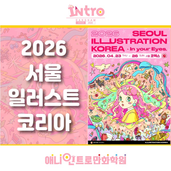 안녕하세요. 인트로만화학원 강남캠퍼스 입니다!~ 국내 최대 규모의 일러스트 행사 중 하나인 일러스트 코리아가 2026년도 서울 중심에서 개최됩니다! 기간이 짧아서 포스팅하는 오늘 기준으로 내일까지입니다! 이점 참고하셔요~ 특히 그림을 좋아 하는 학생들, 그리고 웹툰, 애니 . 일러스트 진로를 고민하는 친구들 이라면 반드시 한번은 경험해봐야 할 행사 입니다. 2026 서울 일러스트 코리아 기간 : 2026년 4월 23일(목)~ 4월 26일 (일) 4일간 관람시간 : 10:00~ 18:00 (입장마감 17:30) 장소 : 서울 코엑스 B2 입장료 : 12,000원 (사전 예매시 할인 가능) 전시품목 : 일러스트레이션 , 캐릭터, 디자인, 회화등 일러스트 관련 삼업일체 다양....... <img src="https://blogthumb.pstatic.net/MjAyNjA0MjVfMjc3/MDAxNzc3MDc1MzEzNDI2.SoTVcKWqqf0KJs3ya5FcUFEw5ykO_vObwsAV0EI-WgEg.YWKARw0VReLH8GIa3NMa70sK1uPuh-Pk5JNwIFtT710g.JPEG/00_%BC%AD%BF%EF_%C0%CF%B7%AF%BD%BA%C6%AE_%C0%FC%BD%C3%C8%B8_%BD%E6%B3%D7%C0%CF.jpg?type=s3" />
