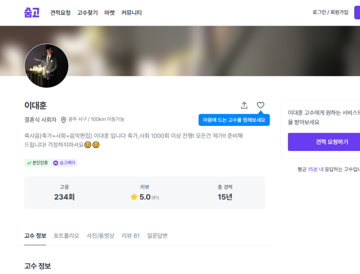 광주 전남에서 활동 하시는 이대훈 사회자 소개 시켜 드립니다^^ 특히 순천에서 사회 진행을 많이 하시는 것 같더라구요! 일단 숨고 에서 활동하는 사회자 중에 압도적 고용횟수... 234회..ㄷㄷ 전남 기준으로는 1등이라고 하시더라구요^^ 리뷰 점수가 5점 만점인데 총 리뷰수 81건 모두 5점 인건 결혼하시는 신랑 신부님들의 만족도가 높았다는 말이겠죠?ㅎㅎ 축사음 이란 - 축가 / 사회 / 음악편집까지 모두 준비가 가능한 회사 라서 축사음 이라고 합니다 ㅎㅎ 사회자로 훨씬 많이 활동 하시는 것 같습니다 샘플로 보내드리는 음악이 50개가 넘어가고 그중에 음악을 고르시거나 음악 편집또한 모든 비용에 포함되어 있어서 합리적인 비용으로....... <img src="https://blogthumb.pstatic.net/MjAyNjA0MTRfMzAw/MDAxNzc2MTUzODMyNjk5.r4f1Ly0G53O_DtDhkf4N3vl4iJS_MvvtYSdo6lDTugsg.iRbwUbA7H1oUjDJ3qdqjCusNkZxAJhNpK-_RvIHkWMEg.PNG/20260414_165857.png?type=s3" />
