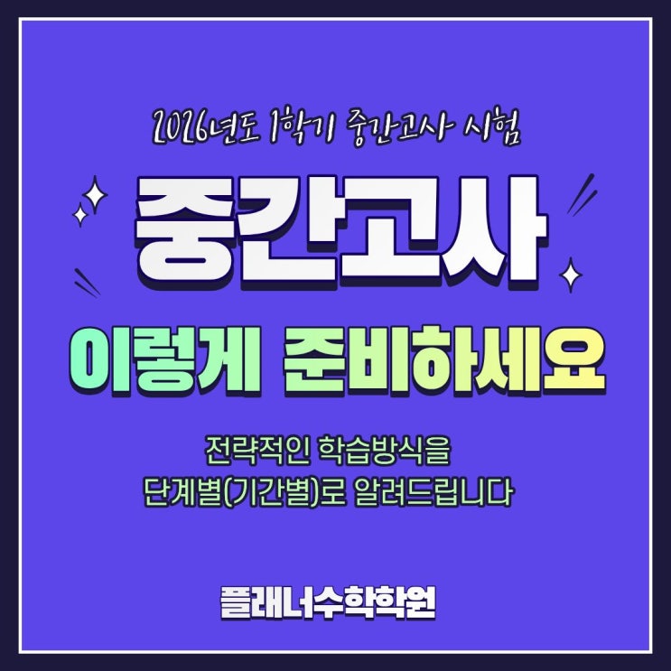 2026년 1학기 중간고사 수학, 지금부터 이렇게 준비하세요 (광명 플래너수학학원) . . . . . . . 안녕하세요 광명 지역 학생들의 성적 향상을 함께하는 플래너수학학원입니다. 4월 말부터 시작되는 1학기 중간고사, 많은 학생들이 아직도 “시간은 남았다”고 생각하지만 수학은 지금 시작해야 결과가 바뀌는 과목입니다. 특히 수학은 1) 단기간 암기 불가 2) 누적형 과목 3) 실전 연습 필수 이기 때문에 체계적인 준비 플랜이 반드시 필요합니다. 중간고사 대비, 이렇게 준비하면 성적이 달라집니다 지금부터 시험 전까지 약 3~4주, 다음 4단계로 준비해야 합니다. . . . . . . . . 1단계: 개념 완성 (시험 3~4주 전) 지금 반드시 해야 하는 단....... <img src="https://blogthumb.pstatic.net/MjAyNjA0MTNfMTAw/MDAxNzc2MDU4Mzk2NjY1.I-ihgAX1FtPzx2DYisrpfwYy5g7UcIljAM88lIPOKXcg.5URhXk-T9oSxJmbZNjEgpB5v1bEv30n4uYlIad7_NT0g.JPEG/%C1%DF%B0%A3%B0%ED%BB%E711111.jpg?type=s3" />