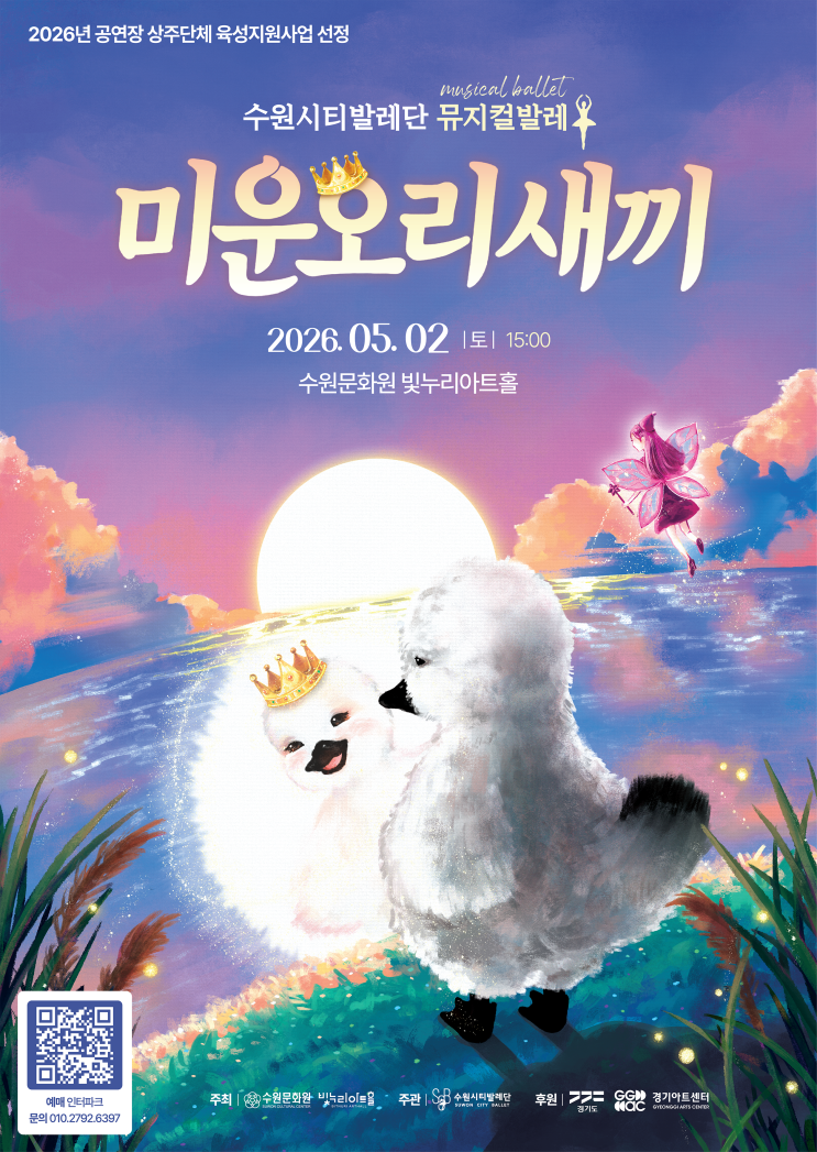 넌 지금 있는 그대로가 가장 아름다워! 뮤지컬 발레 '미운오리새끼'로 만나는 변화의 이야기를 소개합니다. 올해 수원문화원 빛누리아트홀의 상주발레단으로 새롭게 채택된 수원시티발레단의 공연입니다. 이 영광스러운 시작을 함께할 공연은 5월 2일, 수원문화원 빛누리아트홀에서 펼쳐질 특별한 공연 "뮤지컬 발레 미운오리새끼" 입니다. 이 공연은 일반 무용 공연이 아닌, 학교 폭력, 따돌림, 괴롭힘으로 힘들어하는 모든 아이들에게 전하는 희망의 메시지가 가득 담긴 공연입니다. 주인공 '미추'의 이야기 잿빛으로 태어난 오리, 미추. 다른 오리들과는 다른 모습이라는 이유만으로 미추는 끊임없는 놀림과 따....... <img src="https://blogthumb.pstatic.net/MjAyNjA0MTVfMjMz/MDAxNzc2MjE3Mzk4NTE5.0j5x0b7VkPkK8QCNf8PzNeKfMeLBh4DEWIVajJyxc0og.Kstx9qttAaoDv30aPwdB6sQTBkzLz5rL35-PgzT2DDEg.PNG/IMG_6175.PNG?type=s3" />