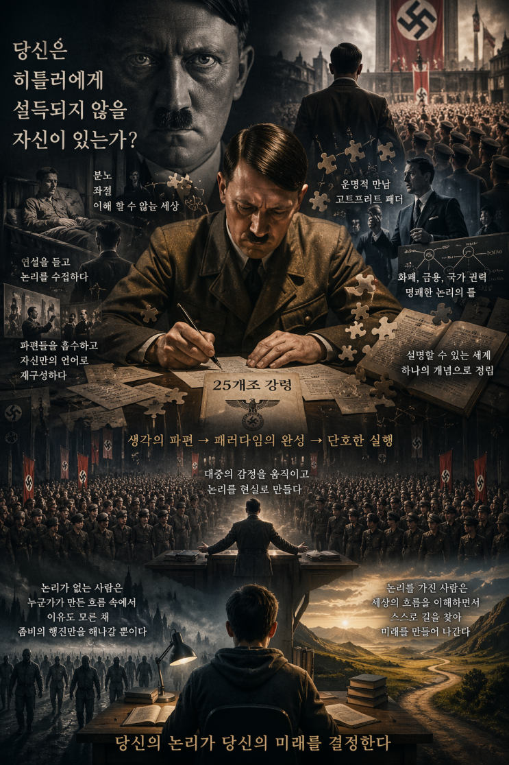 우리는 흔히 한 사람의 출발을 과소평가한다. 히틀러 역시 처음부터 거대한 권력을 쥔 인물이 아니었다. 그는 전쟁이 끝난 뒤, 분노와 좌절만을 품은 채 돌아온 한 명의 제대군인에 불과했다. 전장에서 부상을 입고 병상에 누워 있던 그는 독일의 항복 소식을 듣는다. 그 순간, 그의 세계는 무너진다. 수많은 젊은이들이 목숨을 걸고 싸운 전쟁이 이렇게 끝난다는 사실을 그는 받아들일 수 없었다. 그의 안에는 설명되지 않는 분노만이 남는다. ---------- 처음의 그는 세상을 이해하지 못했다. 왜 졌는지, 무엇이 잘못된 것인지, 누가 책임져야 하는지. 그는 알지 못했다. 그래서 그는 단지 분노했다. ---------- 그러나 그의 삶에는 하나의 전....... <img src="https://blogthumb.pstatic.net/MjAyNjA0MjFfMjQz/MDAxNzc2NzEyMjI1MDM4.HT0T95WuRo8_PxZxIcsrgzBzouiha2ZzEJYI87l5Sg4g.c0r5Qtn3rF5LnNB4YVFoYHbZARhGlHRLycsFrNkWij0g.PNG/%BF%B5%B9%F8.png?type=s3" />
