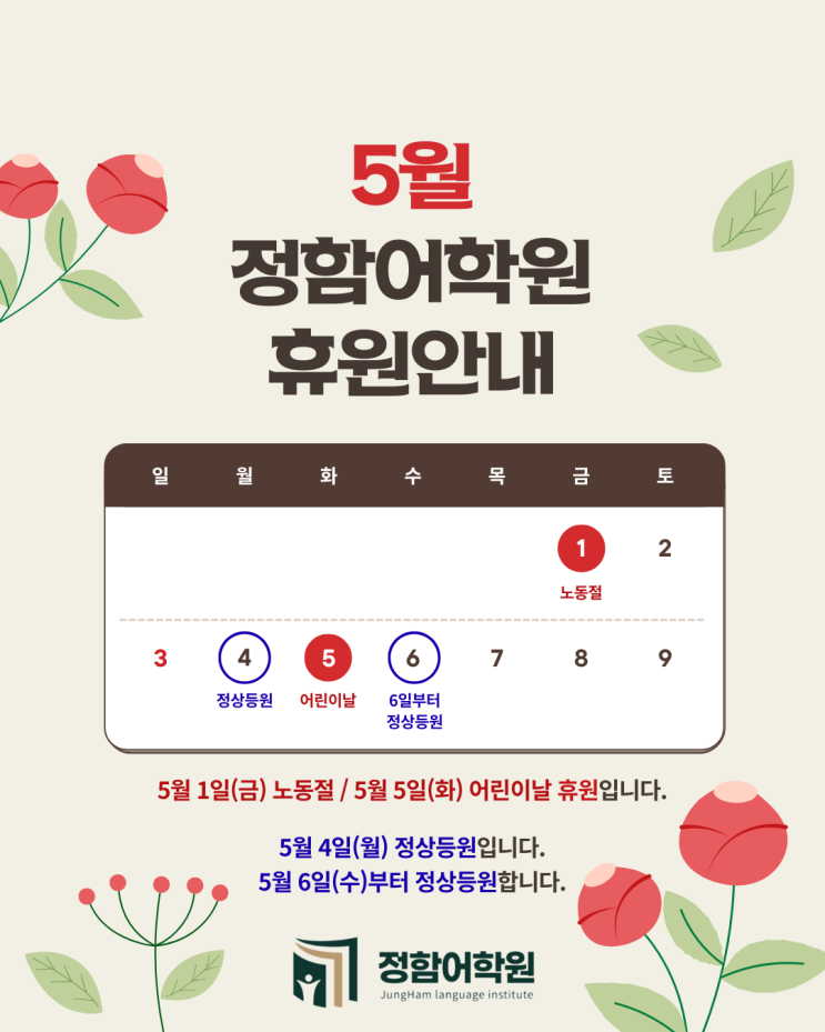 안녕하세요 정함어학원입니다. 5월 학원 일정 안내드립니다. 가정의 달을 맞아 일부 휴원 및 정상 등원 일정이 있으니 확인 부탁드립니다. 휴원일 안내 5월 1일(금) : 노동절 휴원 5월 5일(화) : 어린이날 휴원 정상 등원 안내 5월 4일(월) : 정상 등원 5월 6일(수)부터 : 정상 등원 가정의 달 5월 휴원 및 등원 일정 확인 부탁드립니다 내신 대비 안내 현재 4월 마지막 주 중학교, 고등학교 중간고사를 앞두고 학생들은 내신 대비에 집중하고 있습니다. 정함어학원에서는 시험 전까지 본문 완벽 암기와 핵심 문법 정리를 꼼꼼히 진행하며, 문제 적용 및 반복 학습을 통해 실전 대비까지 철저히 마무리할 예정입니다. 학....... <img src="https://blogthumb.pstatic.net/MjAyNjA0MjFfMjM4/MDAxNzc2NzUxMTEzMDI4.RHfUrx0NshwWnaFgSfjE1fGxO6gMnDlH2PsAwlxcltUg.Y7FGrVw83xt6uUV9mbIA5oMIBePNiIeU5axARMQeisgg.PNG/26.05_%C8%DE%BF%F8%BE%C8%B3%BB.png?type=s3" />