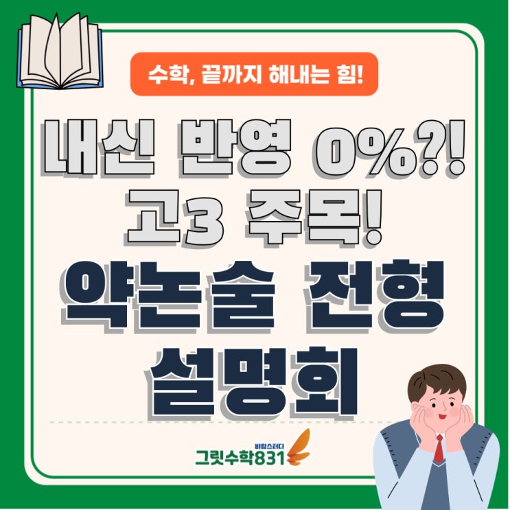 수학, 끝까지 해내는 힘!! 안녕하세요~ 수성구 수학학원 내신과 수능을 철저하게 대비하는 그릿수학831입니다 :) 오늘 포스팅은 내신 성적이 약한 고3 학생이라면 꼼꼼하게 읽어 주시길 바랍니다. 내신 반영 0퍼센트?! 내신 성적이 안 좋아도 대학은 잘 가고 싶은 고3 학생들~주목! 그 방법을 상세하게 알고 싶다면, 이번 설명회에 꼭 참석하세요 먼저 약논술전형이란?! ▶단답형 또는 50자 내외의 짧은 서술형 답을 요구하는 논술고사로, EBS 수능 연계교재를 중심으로 고등학교 정기고사의 난이도 문제로 출제되며, 정답과 오답이 명확하게 구분됨. ✔일반 논술에는 자신 없고 준비 시간이 부족한 학생 ✔수능 준비와 병행....... <img src="https://blogthumb.pstatic.net/MjAyNjA0MjFfOTMg/MDAxNzc2NzUxNjM5NzQ5.WWD-wZk0woN-MWjeEr1TirGzOo76fY-mq4cbdWNUq84g.V0y7qbL7Gz3soideCd1CW-33aDl1E2-11dp0F7nBO_8g.JPEG/%BA%ED%B7%CE%B1%D7-%BD%E6%B3%D7%C0%CF-001_%2815%29.jpg?type=s3" />