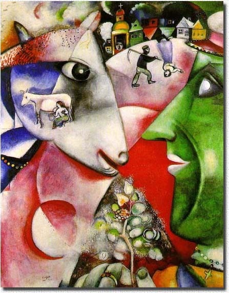 샤갈은 러시아에서 태어났으나 1910년 24살에 그림을 위해 프랑스로 이주했습니다. 그래서, 그의 작품 속에는 러시아인, 유대인, 파리의 세 가지 배경을 다양하게 표현하고 있습니다. <나와 마을>은 샤갈이 파리에서 어린 시절의 유대인 고향마을을 회상하며 사랑을 담아 그린 그림입니다. 야수파의 원새과 피카소의 큐비즘이 떠오르기도 하지요~ 샤갈은 "파리에 와 있는 나에게는 고향마을이 암소의 얼굴이 되어 떠오른다."라고 말했다고 해요^^ <img src="https://blogthumb.pstatic.net/MjAyNjA0MTRfMTcy/MDAxNzc2MTU5OTAyOTkx.CrUp33IA-kjUN5Lj6bDKtcRKplLhMSvGleK7cYn02Pkg.Jg44W6Q1-m2iAbYRVA4655plktyr6gRm1CEHx30K-QMg.JPEG/%B4%D9%BF%EE%B7%CE%B5%E5-51.jpeg?type=s3" />