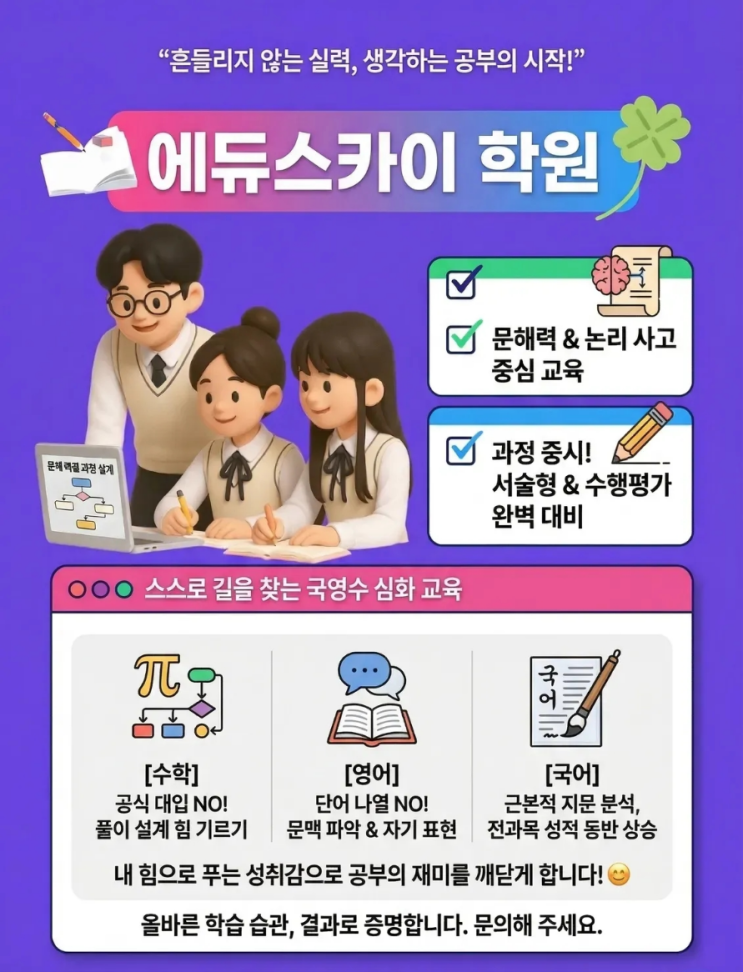 안녕하세요 원당 어울림마을 에듀스카이학원입니다. 아이들이 공부를 어렵게 느끼는 데는 분명한 이유가 있습니다. 개념을 이해하기도 전에 풀이 방식만 외우다 보니 조금만 문제가 바뀌어도 막막함을 느끼게 되죠. 에듀스카이학원은 이런 주입식 교육에서 벗어나 아이들이 스스로 길을 찾는 공부를 지향합니다. 국어 영어 수학 결국 핵심은 하나입니다 저희는 과목을 따로 떼어 생각하지 않습니다. 모든 공부의 밑바탕은 문장을 읽어내는 문해력과 논리적인 사고력이기 때문입니다. [수학] 공식만 대입하는 게 아니라 풀이 과정을 직접 설계하는 힘을 기릅니다. [영어] 단어만 나열하는 게 아니라 문맥을 파악하고 자기 생각을 표현합니다. [국....... <img src="https://blogthumb.pstatic.net/MjAyNjA0MTFfMTUy/MDAxNzc1OTA1MDk0NDY3.bdCHDnZWC4UkcW6LPLF5-rYrOx7KcXSFbhtDGjgFVZog.mBtn5JSds6Royh2Py50p7mH2P8qYsxf107mcG0Cfpq4g.PNG/%C1%A6%B8%F1%C0%BB_%C0%D4%B7%C2%C7%D8%C1%D6%BC%BC%BF%E4..png?type=s3" />