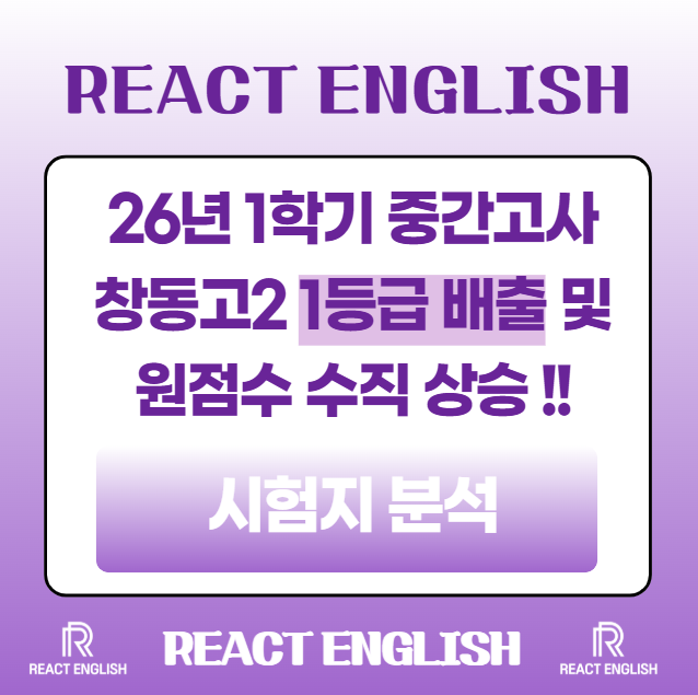 안녕하세요. 리액트 영어학원입니다. 이번 중간고사를 통해 학생들이 그동안 준비해온 학습 내용이 어떤 결과로 이어졌는지를 확인할 수 있었습니다. 시험 과정에서 보여준 집중력과 꾸준함은 단순한 점수를 넘어, 앞으로의 성장 가능성을 충분히 보여주는 부분이었습니다. 이러한 과정이 안정적으로 이어질 수 있었던 데에는 학부모님들의 꾸준한 관심과 지원 또한 큰 힘이 되었으리라 생각합니다. 이번 시험은 26학년도의 첫 내신시험인 만큼 단순한 결과 확인을 넘어, 앞으로의 학습 방향을 설정하는 중요한 기준이 되는 시험이었습니다. 이에 따라 시험의 출제 특징과 학습 전략을 함께 안내드립니다. 시험 직후 재원생 문자 리액트 창동고2 ....... <img src="https://blogthumb.pstatic.net/MjAyNjA0MzBfMjY2/MDAxNzc3NDgxMDk3ODIz.tIfI-GCPGTiZFBU488sShAvShW4Vx66aIek8XEffpAcg.LkIHNgrPq-aYVR1cFpVvTa8heteZCzIlf-8keXhhg8kg.PNG/image.png?type=s3" />