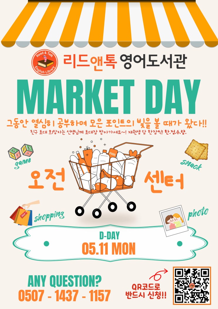 리드앤톡 영어도서관 MARKET DAY 안내 아이들이 그동안 열심히 공부하면서 모은 포인트를 직접 사용해보는 특별한 날! 리드앤톡 영어도서관에서 기다리고 기다리던 Market Day가 열립니다 일시: 5월 11일 (월) 이번 마켓데이는 단순한 이벤트가 아니라, 아이들이 직접 참여하고 경험하는 작은 영어 시장이에요! Market Day에서는 무엇을 하나요? ✔️ Shopping Zone 그동안 열심히 공부하며 모은 포인트로 간식과 다양한 물건들을 직접 구매해요! ✔️ Game Zone 재미있는 게임을 통해 추가 포인트도 얻고, 친구들과 즐겁게 영어로 소통하는 시간! ✔️ Snack Zone 아이들이 가장 좋아하는 맛있는 간식들을 포인트로 소....... <img src="https://blogthumb.pstatic.net/MjAyNjA0MjhfMTA1/MDAxNzc3MzY5MDE2NTk2.DnMPM4llNFp-TCOYQhfVlwzxFMbN4LaEEd4fZYqG0O8g.nIHvqf3qd1tiY9vZkG7MmuQM-VPzq0P0rFnnSrX8I1sg.JPEG/%C1%A6%B8%F1%C0%BB-%C0%D4%B7%C2%C7%D8%C1%D6%BC%BC%BF%E4__%BA%B9%BB%E7%BA%BB-001.jpg?type=s3" />