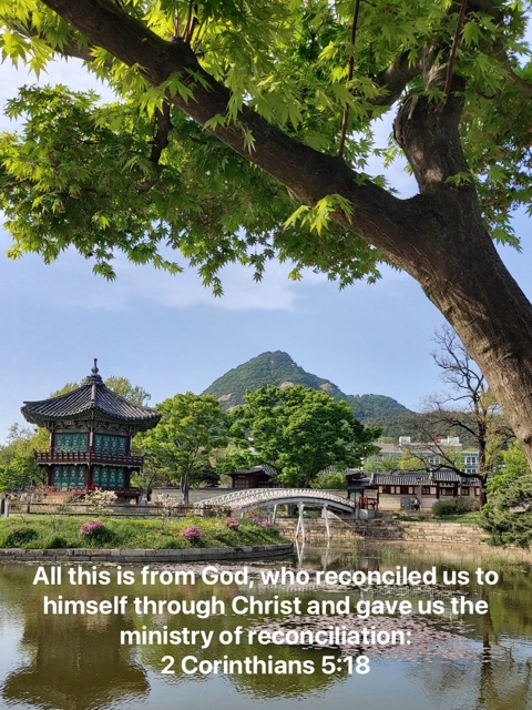 “All this is from God, who reconciled us to himself through Christ and gave us the ministry of reconciliation:” 2 Corinthians 5:18 NIV https://bible.com/bible/111/2co.5.18.NIV [고후5:18, 개역한글] 모든 것이 하나님께로 났나니 저가 그리스도로 말미암아 우리를 자기와 화목하게 하시고 또 우리에게 화목하게 하는 직책을 주셨으니 <img src="https://blogthumb.pstatic.net/MjAyNjA0MjRfMTE4/MDAxNzc2OTg5ODQ4NTE3.k72Sc5Te4zoomwIBcfSMkbp5mA6P30VnoWnF2E-VvSUg.hK_E1Gs6Wj83ZYvSh2btRD-oW37yBuZYfl2PqqHtyoUg.JPEG/save%A3%ADimage.jpg?type=s3" />