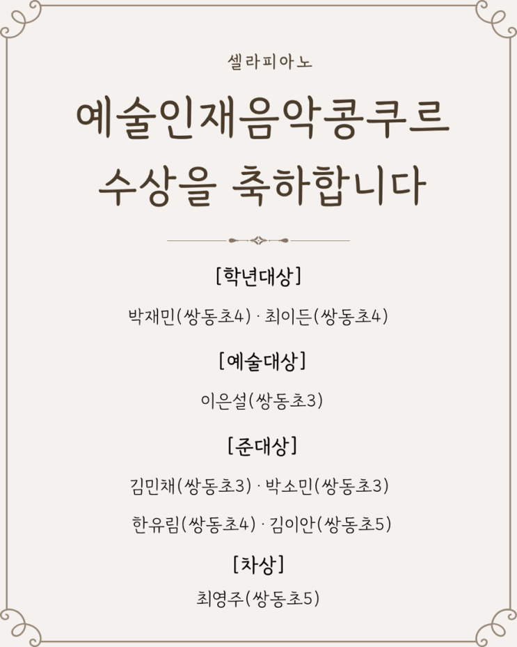 예술인재콩쿠르 수상 소식입니다 셀라피아노 친구들이몇 달 동안 한 곡 한 곡 정성껏 준비하며열심히 달려온 결과, 전원 입상이라는 기쁜 소식을 전하게 되었습니다. 아이들의 연주를 위해매일 고민하고 함께 만들어온 시간들이이렇게 좋은 결과로 이어져 더욱 감사한 마음입니다 무대 위에서 끝까지 최선을 다해준 우리 아이들, 그리고 늘 곁에서 응원해주시는 부모님들께 진심으로 감사드립니다 아이들에게 이번 경험이오래 기억될 소중한 순간이 되기를 바랍니다. 축하합니다 셀라 피아노 교습소 “사랑이 담긴 선율”이라는 뜻을 가지고 있습니다. 레슨 대상 유치부 | 초등부 | 중고등부 | 콩쿨반 | 전공반 | 성인....... <img src="https://blogthumb.pstatic.net/MjAyNjA0MTVfNjMg/MDAxNzc2MjU4NzQyOTIw.supM9tuosXmDlLeqIP49QxGx_no5LH5Okt2zNfH2DRkg.ddAW9V9dxP6BUmhSz9u7tQsZ3en3JQotxr4BDEPT7qog.PNG/IMG%A3%DF4043.PNG?type=s3" />
