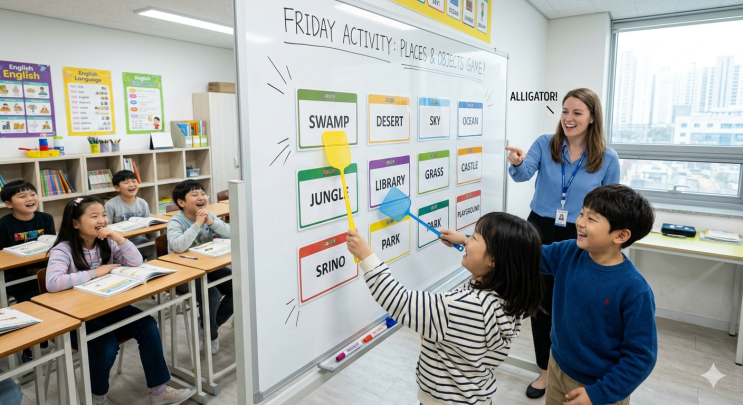 안녕하세요, 태전동영어학원 여러분! 어제는 한 주를 마무리하는 금요일, 우리 학원의 인기 프로그램! 바로 금요 액티버티 시간이었습니다. 이번 주는 어떤 재미있는 활동으로 우리 아이들과 함께 영어 실력도 쑥쑥 키우고, 즐거운 추억을 만들었는지 궁금하시죠? 이번 주 주제는 바로 "Places"와 "Objects" 매칭 게임이었는데요. 학원 화이트보드에 다양한 장소에 대한 단어 카드를 붙여놓고, 선생님이 제시하는 사물 단어와 어울리는 장소를 찾아 파리채로 빠르게 맞추는 게임이었습니다 SWAMP에 ALLIGATOR? 학원에 들어서자마자 아이들의 눈이 반짝반짝 빛나기 시작했는데요. 화이트보드에는 swamp, desert, sky, ocean, ....... <img src="https://blogthumb.pstatic.net/MjAyNjA0MThfMTky/MDAxNzc2NDY3Njk3Mjg1.e48fGe5B7ZHLOKElX5HdEV0xqH8Oa0V5EdCcU9fN1acg.Akrv64xtZa66de04-okfiZMC8dNl4xn2u3qnP_2FG2og.PNG/Gemini_Generated_Image_66qygz66qygz66qy.png?type=s3" />