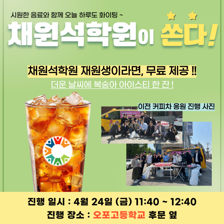 채원석학원 커피차 이벤트 : 이번에는 오포고 앞으로 ! 안녕하세요! 채원석학원입니다. 내신 시험으로 지쳐있을 우리 학생들에게 응원을 하기 위해 달콤한 음료와 함께 찾아갑니다! 채원석학원에서 커피차 이벤트를 준비했습니다! 우리 재원생들에게는 무료 음료가 제공되며, 비재원생 친구들도 간단한 참여로 맛있는 음료를 즐길 수 있어요! 비재원생 참여 방법 (1,2번 중 한 가지 선택하여 참여) ① 현장에서 “채원석학원 파이팅!” 외치기 ② 채원석학원 인스타그램 팔로우 인증 [이벤트 일시] 2026년 4월 24일 (금) 오전 11:40 ~ 오후 12:40 [이벤트 장소] 오포고등학교 후문 옆에서 진행합니다. 지금 이 순간도 열심히 공부....... <img src="https://blogthumb.pstatic.net/MjAyNjA0MjBfNTIg/MDAxNzc2NjY3MDM0NTMz.2W74hwX5kz-L4w-eRLBxTgo3gK5bihosdLt4bGl3_F4g.Amnfm9999hGZM7o45dImYIKin8L31I7XW9sN1xjW_t8g.PNG/001.png?type=s3" />