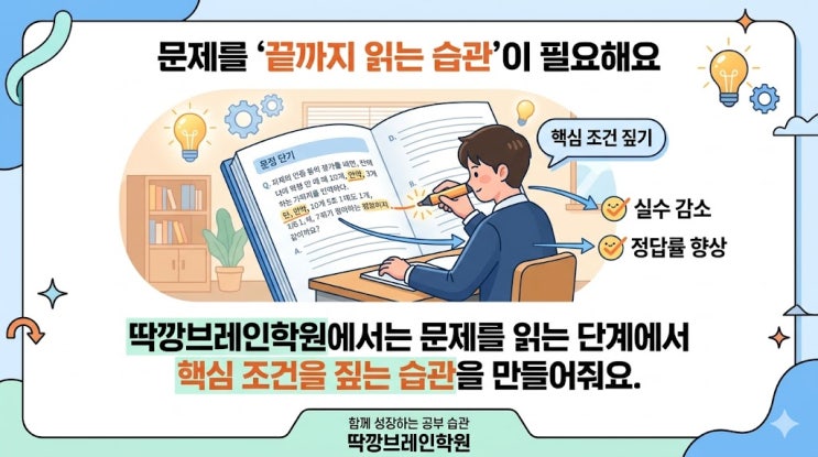 안녕하세요 고산동 국영수학원 딱깡브레인학원 입니다 :) 시험을 보면 “이건 아는 문제였는데…” 이 말, 정말 자주 나오죠. 모르는 문제보다 아는 문제에서 틀리는 경우가 더 많고, 그게 점수를 크게 깎아먹어요. 그런데 이 실수는 문제를 푸는 능력보다 문제를 풀기 전 단계에서 갈리는 경우가 많아요. 고산동수학학원, 딱깡브레인학원에서는 이 ‘풀기 전 과정’을 수업에서 가장 중요하게 보고 있어요. 문제를 ‘끝까지 읽는 습관’이 필요해요 많은 아이들이 문제를 대충 읽고 바로 풀기 시작해요. 특히 익숙한 유형이라고 생각하면 중간을 건너뛰고 풀이부터 들어가는 경우가 많아요. 이렇게 되면 조건 하나를 놓치거나 단위를 잘못 보는....... <img src="https://blogthumb.pstatic.net/MjAyNjA0MTRfMjgy/MDAxNzc2MTQxMjgxOTQ5.Q5kc_cnqLw0HWq7GPhySagQ_GqahD1NMhUN5vOmBodkg.VxSQWZghYKrPTTfn7k_12Ld4d0NplYfYSBBgSZP2ntsg.JPEG/db5a5adf-ff81-42fd-9611-8ba47181341d.jpg?type=s3" />