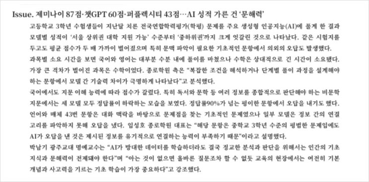 ✔ 챗GPT도 틀린 문제, 이유는 단 하나였습니다 ✔ 계산이 아니라 ‘문해력’에서 성적이 갈립니다 ✔ 지금 준비하지 않으면 중등에서 무너집니다 최근에 흥미로운 기사를 하나 봤습니다. AI에게 수능 문제를 풀게 했는데 결과가 예상과 달랐습니다. 정답률이 완벽하지 않았고 특히 문해력이 필요한 문제에서 많이 틀렸습니다 “AI도 틀린 이유” 처음에는 조금 놀랐습니다. “AI도 틀린다고?” 그런데 내용을 자세히 보니 오히려 더 중요한 사실이 보였습니다. AI가 틀린 이유 = 문해력 부족 문장을 정확하게 이해하고 조건을 연결하고 의도를 파악하는 능력 이 부분에서 AI도 실수를 했다는 겁니다. 이걸 보면서 딱 한 가....... <img src="https://blogthumb.pstatic.net/MjAyNjA0MTVfMjI0/MDAxNzc2MjE4NzcwNjY3.hOFUdF12Nn5ecC8vdZM_HUpFYKZRXC_GfvS0IKnAK-4g.7bb84W7WKl7wL2LDa_LqPpqHM7HOvXWygRs1GDuTTUgg.JPEG/Screenshot_20260415_102121_NAVER.jpg?type=s3" />
