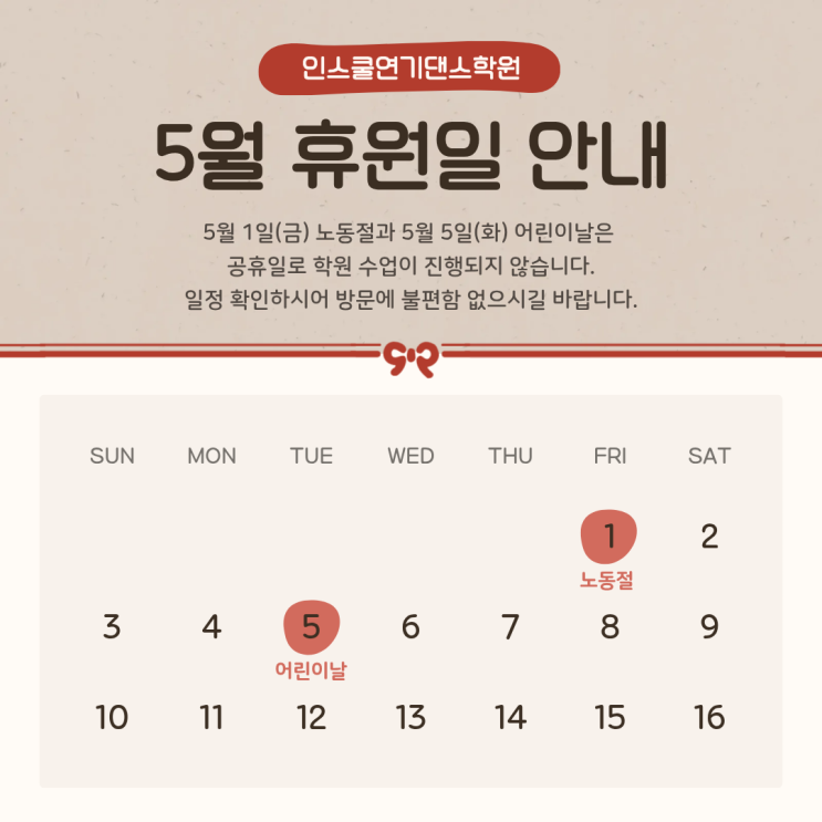 안녕하세요! 경기광주 태전동에 위치한 인스쿨연기댄스학원입니다:) 5월 1일 근로자의 날과 5월 5일 어린이날은 학원 휴원일로 수업이 진행되지 않습니다! 유아/학생반, 성인반 모두 수업이 없으니 이 점 확인하시고 방문해주세요~ 감사합니다:) #경기광주댄스학원 #경기광주태전동댄스학원 #댄스학원 #방송댄스학원 #인스쿨연기댄스학원 #연기댄스학원 #연기학원 #학원휴무안내 <img src="https://blogthumb.pstatic.net/MjAyNjA0MjJfMjE4/MDAxNzc2ODM3ODg4NTAx.QnUED5kgUDdirUvVH4tMZcSBPhHX3B0Cd5rSHP1AptYg.lYc6Xechj56DC3IADSDSZZxLM2l4tJmsQYjREMeSAwAg.PNG/5%BF%F9_%C8%DE%BF%F8%C0%CF_%BE%C8%B3%BB.png?type=s3" />