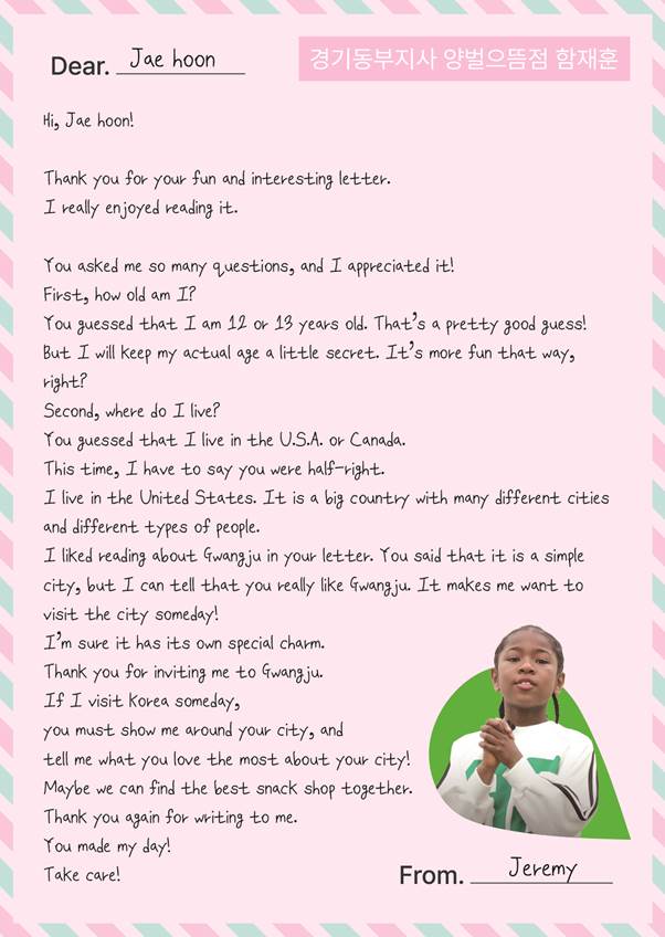 안녕하세요 ^^ 오늘도 행복한 뮤엠영어 양벌으뜸학원입니다. 신학기를 맞이한 첫번째 이벤트! LINK에서 만나는 원어민 친구에게 편지쓰기 이벤트 기억나시나요? 전국에 있는 뮤엠영어에서 진행 된 신학기 이벤트였는데요? 우리학원에서 무려 3등이 나왔습니다 ♥ 너무너무 기쁘답니다. 상품은 물론, 원어민 친구에게 답장까지 받았는걸요? 대단해! 자랑스러워 기쁘고, 행복한 순간을 공개 합니다 :) 먼저 사랑둥이가 JEREMY에게 쓴 편지를 보겠습니다. 짜잔!JEREMY에게 받은 답장입니다 ♥ 다음은 영상으로 받은 답장입니다.♥ 처음만난 3년전 보다 시간이 흘러 JEREMY도 성숙한 모습이 보이네요 ^^ 특히나 JEREMY는 광주에 대해 쓴 부분이 좋았....... <img src="https://blogthumb.pstatic.net/MjAyNjA0MTdfMjI0/MDAxNzc2NDExNjkxOTUy.65AG9mMzlHiFavewg2zxhWrkDLWgNtgsrbRPqWkFUAgg.8XWd8vSSg0767hZJ-2GA3fDZ5__sqdVwiqDXYPCe5mog.JPEG/%B4%D9%BF%EE%B7%CE%B5%E5.jpg?type=s3" />