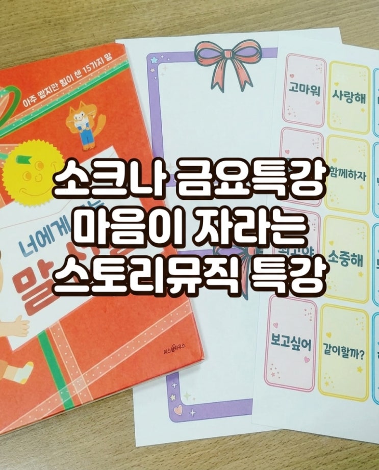 소크나한양음악학원 금요특강 너에게 주는 말 선물 새학기, 낯설고 조금은 불안한 마음… 우리 아이들에게 지금 가장 필요한 건 “괜찮아, 잘하고 있어”라는 따뜻한 한마디입니다 오늘 금요특강 시간에는 제가 평소좋아하는 그림책으로 우리 아이들에게 꼭 들려주고 싶었던 그림책을 함께 나누었습니다. ‘다섯 글자 예쁜 말’ 노래를 듣고 함께 부르며 아이들이 다섯 글자로 마음을 표현해보는 시간을 가졌습니다. 여러번 들어도 참 기분좋은 가사와 선율이에요. “존경합니다” “배려합니다” “칭찬합니다” “너는 최고야” 아이들의 입에서 나온 따뜻한 말 한마디에 오히려 더 큰 감동을 받는 시간이었습니다 ?....... <img src="https://blogthumb.pstatic.net/MjAyNjA0MTBfMjQ0/MDAxNzc1ODI0Mjg2NzI1.4o3vo3lKBcwo-AWX4-hheqzaW_iKwjwYhOv9gO5mwm8g._Y3X4-EfqWt15VafxEFGjoPSssxEYNN0zhqlGi4MQZUg.JPEG/900%A3%DFfile%A3%DF1775818867740.jpg?type=s3" />