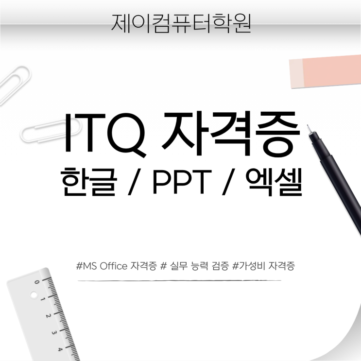 안녕하세요~ 은평구 컴퓨터학원 제이컴퓨터학원입니다. 평일 오전에도 짬을 내어 수강하러 오시는 분들은 학업과 직장, 아르바이트로 바쁜 와중에도 자격증 취득에 열심을 내고 계십니다. 다양한 컴퓨터 자격증이 있지만 그중에서도 기초를 쌓아가면서도 취업 시 자격증란을 실용적으로 채울 수 있는 ITQ 자격증을 준비하는 분들이 많습니다. ITQ 자격증은 어떤 자격증일까요? 한국생산성본부(KPC자격)에서 주관하며 문서 프로그램을 활용하는 능력을 평가합니다. MS Office 프로그램인 엑셀, PPT와 아래한글 프로그램을 가장 많이 응시합니다. * ITQ한글 시험 구성 1) 스타일 한글, 영문으로 글 작성 후 스타일 적용 2) 표&차트 표 내용, 서....... <img src="https://blogthumb.pstatic.net/MjAyNjA0MjRfMjEy/MDAxNzc2OTk0MzQ3MjY1.vz42uO9WE52cJuzAvv75ebdrjXwviTT51NLrflSgm70g.fNgLWzqvO_uM8Vc1Sr2APdRpwZHiZ0uRkE3aXhQrwNMg.PNG/1.png?type=s3" />