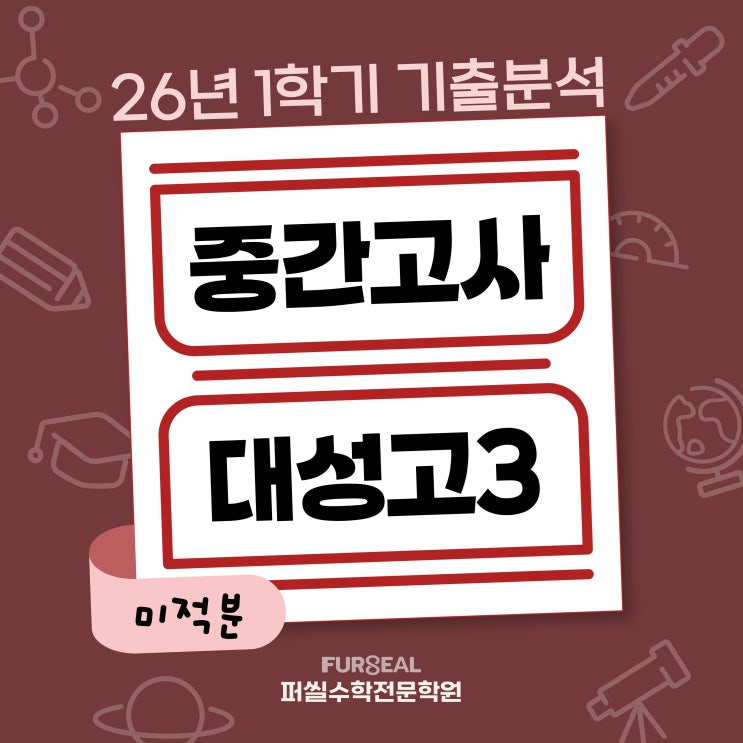 안녕하세요! 퍼씰수학전문학원입니다~! 오늘은! 4월 24일 금요일에 치뤄진 대성고 3학년 1학기 미적분, 시험 리뷰를 해보려고 합니다! 블로그 읽기 전 잠깐!!!! 기출 분석 영상도 있다는 사실, 알고있나요? 3학년 담당이신 남호성 선생님께서 준비해주신 미적분 기출 분석 영상입니다! 아래 영상을 보고 블로그를 읽으면 더 많은 도움이 될 것 같은데요! 우리 영상 먼저! 보러갑시다! https://youtu.be/xTZ77NC_aHA 자, 그럼 본격적으로 시작해보겠습니다! 목차는! 아래와 같습니다. 자, 그럼 분석 내용 함께 살펴볼까요? Tip! _ 본인이 푼 시험지를 함께 펼쳐놓고 보면 이해가 더 잘 될 거예요! 1️⃣ 작년이랑 뭐가 달라졌을까? 가장 큰 외....... <img src="https://blogthumb.pstatic.net/MjAyNjA0MjdfMjQx/MDAxNzc3MjcwOTg3MzQy.g4qxaIxDlZf8JWWD6y6ama5CJ0HjcGB76y0THKo530og.V7Dv8SbOpHKX48RfFavIs9zgaQEZxaQPYm7pHJZ_sZ8g.JPEG/%B4%EB%BC%BA%B0%ED_3.jpg?type=s3" />