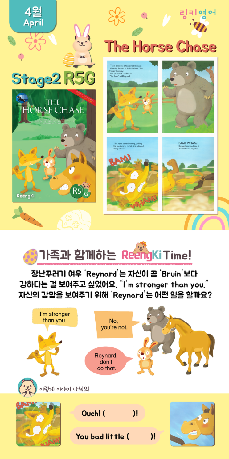 안녕하세요 내포신도시 링키영어입니다. 이번 달 Stage 2-1 수업에서는 아이들이 “The Horse Chase!” 스토리에 푹 빠져 즐겁게 수업에 참여하고 있습니다. 스토리로 배우는 영어 Reynard는 자신이 Bruin보다 강하다는 것을 보여주고 싶어합니다. “I’m stronger than you.” 아이들은 이 장면을 통해 stronger(비교급)의 의미를 자연스럽게 이해하고 있습니다. (1월 교재 The Boy and the Cats에서 배웠던 표현이 반복되어 더 쉽게 연결하고 있습니다 ) 단순히 외우는 것이 아니라 “누가 더 강한지” 상황 속에서 받아들이고 있습니다. ⸻ 몸으로 배우는 확장 활동 수업 시간에는 팔씨름 대결도 해보....... <img src="https://blogthumb.pstatic.net/MjAyNjA0MjBfMjM3/MDAxNzc2NjkyMzcwMzMy.cgmkQpzjkjv_YdXJA28no1nJ4Ybx87iRNgtdNea6il0g.D23CFbPUjmxAsnda-NzczeY0Rbtq8ekl6RMyymTOdOQg.PNG/IMG%A3%DF0826.PNG?type=s3" />