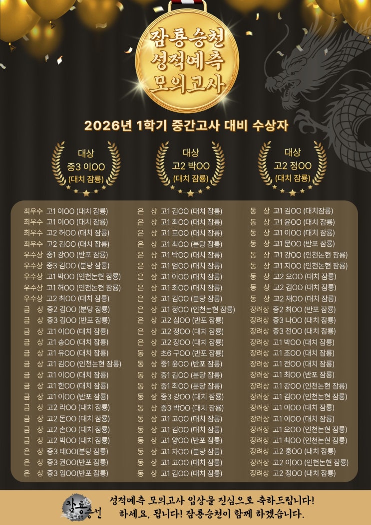 대치 잠룡승천 2026년 1학기 중간대비 성적예측 모의고사 대상 수상자