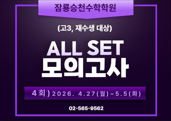 안녕하세요~ 대치동 잠룡승천수학학원 입니다. 잠룡승천 ALL SET 모의고사 (4회)를 실시합니다 !! 2027년 수능대비!! 고3, 재수생 대상! 잠룡승천 'ALL SET 모의고사'로 수학 성적의 잠재력을 깨고 SKY로 날아오르십시오! 1. 대상: 고3, 재수생 2. 일정 : 4/27(월) ~ 5/5(화) 3. 시간: 100분(OMR 마킹 포함) 4. 장소: 스카이룸 잠룡승천 올셋 모의고사 (3회) 시행 결과 휘문고3 : 000학생 / 100점 !! 축하합니다!!! 하세요. 됩니다! 잠룡승천이 함께하겠습니다. 02-565-9562 <img src="https://blogthumb.pstatic.net/MjAyNjA0MTdfMjk2/MDAxNzc2NDA5NzAxNjcw.iWuEf36uk0XUssRGB63RKsMkKrAd3xjtYqNJPFDMKRAg.WWmt4ftoI47Q2C5XnN7k6cG4xQvUgKRMWI2h7JnB5hMg.PNG/image.png?type=s3" />