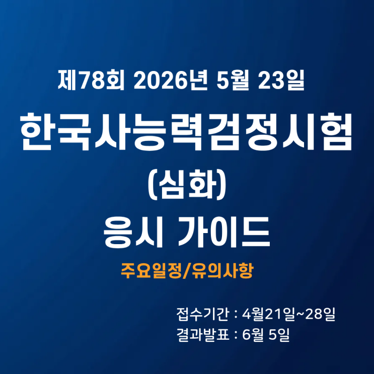 제78회 한국사능력검정시험 응시 가이드: 주요 일정부터 유의사항까지 안녕하세요! 제78회 한국사능력검정시험(한능검) 응시 요강 핵심 내용을 정리해 드립니다. 특히 공무원 채용이나 교원임용을 준비하시는 분들께는 필수적인 시험인 만큼, 이번 포스팅을 통해 원서 접수부터 시험 당일 준비물까지 꼼꼼히 확인해 보세요! 오늘(2026년 4월 21일)은 마침 인천과 경기 지역의 정기 접수가 시작되는 날입니다. 지금 바로 접수하세요! ◆ 한국사능력검정시험 개요 <목적> ▶ 우리 역사에 대한 관심을 확산, 심화시키는 계기마련, 균형잡힌 역사의식 함양 ▶ 한국사 전반에 걸친 역사적 사고력을 평가하여 역사 교육의 올바른 방향 제시 ▶자....... <img src="https://blogthumb.pstatic.net/MjAyNjA0MjFfMTEz/MDAxNzc2NzQwMzc4MDAy.Sxfa8ZHryNuoZ8DsXS48E2Rl80kqrMdFj7opbT68Q9Eg.ByPUSrsX1PmisJNPtWUqEEfoxeBJrHY6p2ZAdSTdI0sg.PNG/%C1%A6%B8%F1%C0%BB_%C0%D4%B7%C2%C7%D8%C1%D6%BC%BC%BF%E4._%2841%29.png?type=s3" />