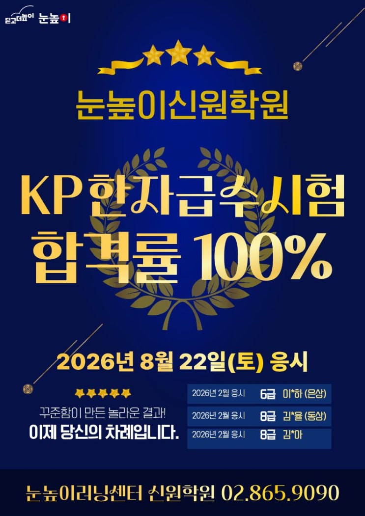 안녕하세요 눈높이러닝센터 신원학원입니다. 최근 '독서국가'가 선포되면서 문해력이 다시 화두에 올랐습니다. 문해력은 글을 읽고 의미를 파악하고 이해하는 능력을 이야기합니다. 글을 읽고 의미를 안다는 것은 어휘력이 좋다는 것과 같습니다. 우리나라 단어의 80%가 한자어로 이루어졌다는 사실, 알고 계신가요? 한자를 잘 아는 것이 곧 글을 읽고 이해하는 능력으로 연결된다는 의미이기도 합니다. 한자 학습에 목표 의식과 재미를 붙여줄 수 있는 것이 바로 KP한자검정시험입니다. KP한자검정시험은 한국평생교육평가원에서 시행하는 한자 자격 시험으로, 국가 공인 시험입니다. 시험을 준비하고, 시험을 치르며 긴장감을 느껴보....... <img src="https://blogthumb.pstatic.net/MjAyNjA0MjFfMTcz/MDAxNzc2NzY1NDc1MTQ2.JtxxUEgehDSFMb3xHzGNP_gQatUWGbhRd_PAoW4_Yd8g.GYvsPTZZSubP2m12Nt76i9XKAz6MPpk_G3HImfyd0WIg.JPEG/%C7%D1%C0%DA%B1%DE%BC%F6_%281%29.jpg?type=s3" />