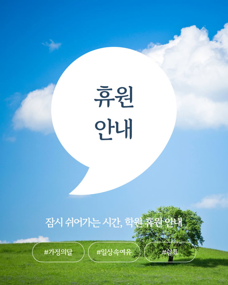 잠시 숨을 고르는 시간입니다. 쉼표 하나 찍고, 5월 1일(금)부터 5월 5일(화)까지 짧은 휴원 기간을 갖습니다. 아이들이 충분히 쉬고 다시 힘차게 나아갈 수 있도록 편안한 시간 보내시길 바랍니다. <img src="https://blogthumb.pstatic.net/MjAyNjA0MjNfNzIg/MDAxNzc2OTMyNzg5MzQx._tB6Q1TWVBi9IiRTrbZtIeZ8wg4zby4Do1QjpVIhLVcg.Wly_9xe3UbqJOcb6oiksy7wJ35miNyI4ulSjMqMnfQQg.PNG/%C8%DE%BF%F8%BE%C8%B3%BB.png?type=s3" />