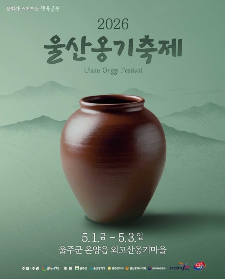 따뜻한 봄바람이 불어오는 5월, 전통의 멋과 감성이 살아 숨 쉬는 특별한 축제가 돌아왔습니다 ☀️ 바로 대한민국 대표 전통문화 축제, 울산옹기축제 입니다! 2026 울산옹기축제 안내 기간 : 2026. 5. 1.(금) ~ 5. 3.(일) 장소 : 외고산옹기마을 일원 옹기의 매력에 빠지는 시간 울산 외고산옹기마을은 전국 최대 규모의 옹기 집산지로, 전통 옹기의 숨결을 그대로 느낄 수 있는 특별한 공간입니다. 이번 축제에서는 단순한 전시를 넘어 직접 보고, 만들고, 체험하는 다채로운 프로그램이 준비되어 있어요! ✔ 옹기 제작 시연 & 체험 ✔ 옹기 전시 및 판매 ✔ 전통문화 공연 & 버스킹 ✔ 가족 참여 체험 프로그램 ✔....... <img src="https://blogthumb.pstatic.net/MjAyNjA0MjdfMjEx/MDAxNzc3MjYwMTA1MDc5.TMCCPTEHv2VR9Wx9dQjWXzrytuGgkAKEDSIq5_iiujog.Aay6rErszt03XVEOX9yq62r0Yjg4JliwTCkuR3HQx7Yg.JPEG/900_Screenshot_20260427_121440_Facebook.jpg?type=s3" />