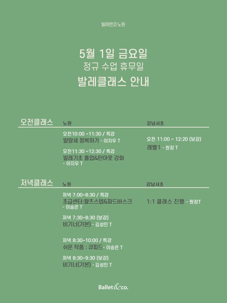 5월 1일 금요일, 정규수업이 쉬어가는 날 특별한 클래스✨ 특별한 클래스 ✅ 오전 10:00~11:30(90분 매트,바,센터) 레벨1&레벨1.5 (초급,초중급) 센터워크 자신감 찾기 ! < 발랑세 정복하기 > 동작과 동작을 자연스럽게 이어주는 핵심 스텝 3가지 동작 배우고 연습하기 -발랑세 / 발랑세 앙트루낭 / 파드브레 드쒸 드쑤 ✅ 오전 11:30~12:30 (60분 매트,발레바) 기초 난이도 < 발레기초 풀업&턴아웃 강화 > 발레의 기본인 풀업(상체 끌어올림)과 턴아웃(고관절 회전)을 개념부터 → 몸 사용까지 차근차근 배우는 기초 특강 ✅ 저녁 7:00~8:30 (90분 매트,바,센터) 베이직 (초급 난이도) < 초급센터 : 왈츠....... <img src="https://blogthumb.pstatic.net/MjAyNjA0MjhfMTYg/MDAxNzc3MzU1OTU4Mjk1.JN9T-5s-kz7USsDmmqNVJ8ZTZOOyl5slbS7bEfWZKX8g.Nzes7Ca_gVHJ0Mf_TJBNn_M57XXPXL17Gsd-Wzaij7Ag.JPEG/26%C0%CE%BD%BA%C5%B8-%C8%DE%B9%AB%C0%CF_5%BF%F9%B3%EB%BF%F8.jpg?type=s3" />
