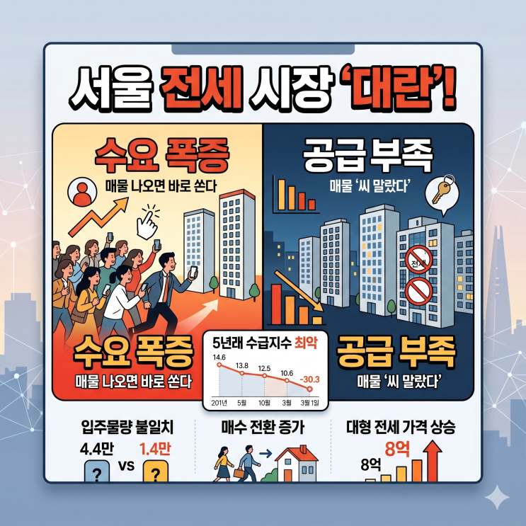 서울 전세 시장의 '씨'가 마르고 있다는 소식에 내 집 마련이나 이사를 준비하시는 분들의 걱정이 깊어지고 있습니다. 향후 서울 주택 입주 물량 통계의 혼선과 전세 시장의 불균형 현상, 그리고 앞으로의 전망을 정리해 드립니다. 1. 엇갈리는 입주 물량 통계, 무엇이 진실일까? 최근 서울 아파트 입주 예정 물량을 놓고 기관별로 통계 수치가 최대 3만 가구씩 차이를 보이면서 실수요자들의 혼란이 가중되고 있습니다. ■ 통계의 차이 : 한국부동산원과 부동산R114가 공동 발표한 2026~2027년 합계 물량은 4만 4,133가구인 반면, 민간 플랫폼인 아실은 1만 4,471가구로 집계했습니다. 특히 2026년 물량만 보면 부동산원은 2만 7,158가....... <img src="https://blogthumb.pstatic.net/MjAyNjA0MjhfMTA3/MDAxNzc3MzU3MTM4MTIx.ezIh7fvWekJBQCSV3BjH0JFyGi5yyRG5hM5mqd2toYsg.on4Dzbu8S5zpzz7lkY9jPQc6ThPNqeRc7yYxyxtRW78g.PNG/Gemini_Generated_Image_2mdnr42mdnr42mdn.png?type=s3" />