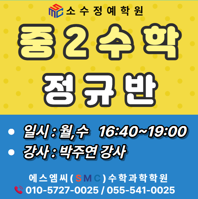 안녕하세요 에스엠씨(SMC)수학과학학원입니다. 오늘 저희학원에서는 <중2수학>에 대해 안내드리고자 합니다. 열심히 하지만 제자리인 학생 내신 및 수능대비가 필요한 학생 왜 공부해야 하는지 모르는 학생 기초가 너무 부족한 학생 이런 학생에게 강추! 몰입과 성적이 중요한 아이를 위해 에스엠씨(SMC)수학과학학원에서는 학생들의 성장을 가까이에서 지켜보며 의미있는 성과를 만들어가겠습니다. 진로, 진학, 입시컨설팅이 포함된 학원! 1:1맞춤상담이 가능한 학원(사전예약필수)! 제대로 아는 전문가와 상담! 자세한 교육과정이 궁금하시다면 언제든지 학원으로 연락주시기 바랍니다. 통화가 어려운 경우 문자 남겨주시면 연락드리겠습....... <img src="https://blogthumb.pstatic.net/MjAyNjA0MjNfMjAg/MDAxNzc2OTMzMjY0MTIz.nL2NCYCyF5GodBp1ECeKH_WkONlQGYIrHEbWSzHOMfQg.NiPQFfJusMOTr1jeWTydjaQDe_eJazk3Ie5kEtQ4ud4g.PNG/image.png?type=s3" />