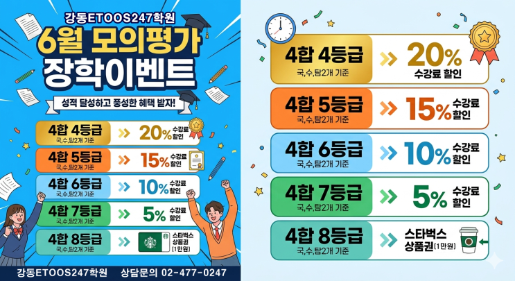 안녕하세요 강동 이투스 247 학원입니다. 이제 곧 5월달이고 6월 모의평가까지 약 한달정도 남은 시점인데요. 수험생분들은 열심히 6월 모의평가를 위해서 달리고 있으시겠죠? 그래서 강동 이투스 247 학원에서는 동기부여의 차원에서 6월 모의평가 성적 장학 이벤트를 진행중입니다! 추가적인 궁금한 사항이나 상담을 원하신다면 02-477-0247 언제든 전화주시기 바랍니다. 감사합니다. <img src="https://blogthumb.pstatic.net/MjAyNjA0MjhfMjEz/MDAxNzc3MzY4NTE2NTc0.Gfo2vc7jFOH6QQWj6qh0svkmlbrrtUru2LGLG7G9-AUg.WDJ-PCTr3WRK07TrzGy78tpqMSPkLMfvrynKQoMeaYEg.PNG/12345.png?type=s3" />