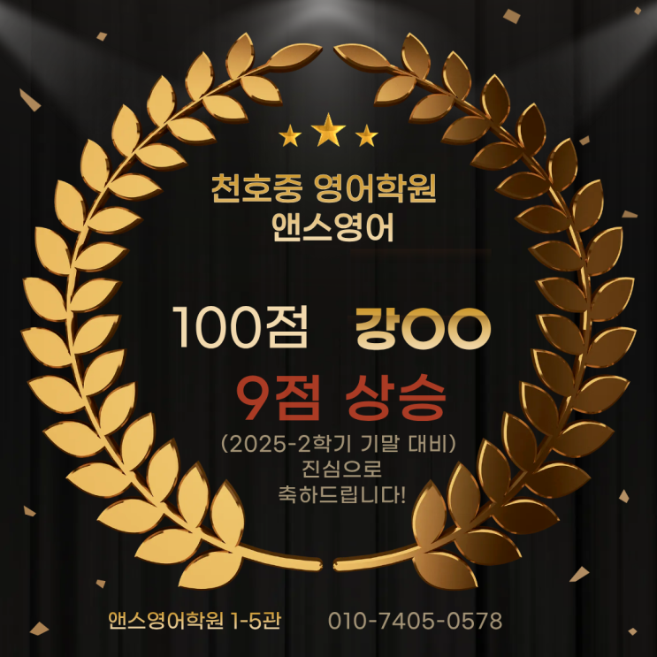 천호중 영어학원 앤스영어학원입니다. 2026년 1학기 중간고사 100점 달성 축하합니다! 안녕하세요 천호중 영어학원 앤스영어입니다. 2026년 1학기 중간고사 결과가 하나둘씩 나오고 있는 가운데, 기쁜 소식을 전해드립니다! 이번 시험에서 천호중3 재원생 100점을 받았습니다. 앤스영어만의 내신 대비 시스템 이번 결과는 학생 개인의 노력과 함께 앤스영어의 체계적인 관리가 만들어낸 성과입니다. ✔ 학교별 맞춤 커리큘럼 ✔ 시중 교재 + 자체 제작 내신 교재 ✔ 형성평가 & 반복 테스트 시스템 ✔ 데일리 클리닉으로 약점 보완 ✔ 시험 직전 보강 & 실전 대비 훈련 천호중 영어시험을 대비하기 위한 천호중 전문 영어학원, 천호중 영....... <img src="https://blogthumb.pstatic.net/MjAyNjA0MjhfNTQg/MDAxNzc3MzU0Mzg4MTk2.gI6y8lDtUPPN1JAm6MAEItmpz75cIpfWmWmYuc01_44g.1VJrx_f5GB9XAhnqczFOfrpV_1tEMAmYq39vG6C3A34g.PNG/%C1%A6%B8%F1%C0%BB_%C0%D4%B7%C2%C7%D8%C1%D6%BC%BC%BF%E4._%2819%29.png?type=s3" />