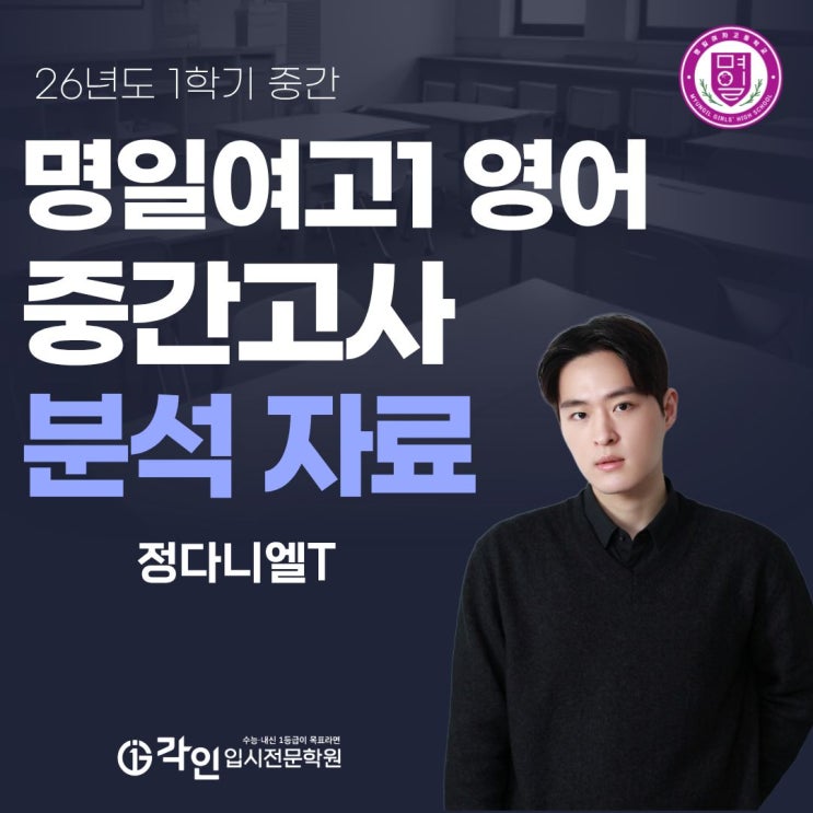 명일여고 1학년 1학기 영어 중간고사 분석 by 정다니엘T ➡명일여고 1학년 기말대비 정규반 : 화 오후 6:30 ~ 오후 10:00 (개강 5.5) 수 오후 4:00 ~ 오후 7:30 (개강 5.6) 목 오후6:30 ~ 오후 10:00 (개강 5.7) (정다니엘 클리닉 : 토 오전 10:00 ~ 오후 5:00) 명일여고 영어, 각인이 압도적입니다. 상담/문의 02-6497-2471 이번 명일여고 영어 중간고사는 전반적으로 난이도는 중상 수준이였지만, 시간 압박이 크게 작용한 시험이었습니다. 전체적으로 보면 절대적인 난이도가 높은 시험이라기보다는, 익숙한 교과서 지문에서 킬러 문제가 출제되며 체감 난이도가 상승한 시험입니다. 특히 독해에서 시간을 많이 쓰게 되면서, 후반 문....... <img src="https://blogthumb.pstatic.net/MjAyNjA0MjlfMSAg/MDAxNzc3NDQzOTIzNDcy.0DpMySJA66ExSr5bpoTTlpxW1-e4lcp99Hs47mk8Ok0g.bBkrozMNZzb5uV06dRBiTs74Lu9pkmd6Hdc3mLA4ADMg.JPEG/26%B3%E2%B5%B5_1%C7%D0%B1%E2_%C1%DF%B0%A3_%C3%D1%C6%F2_%282%29.jpg?type=s3" />