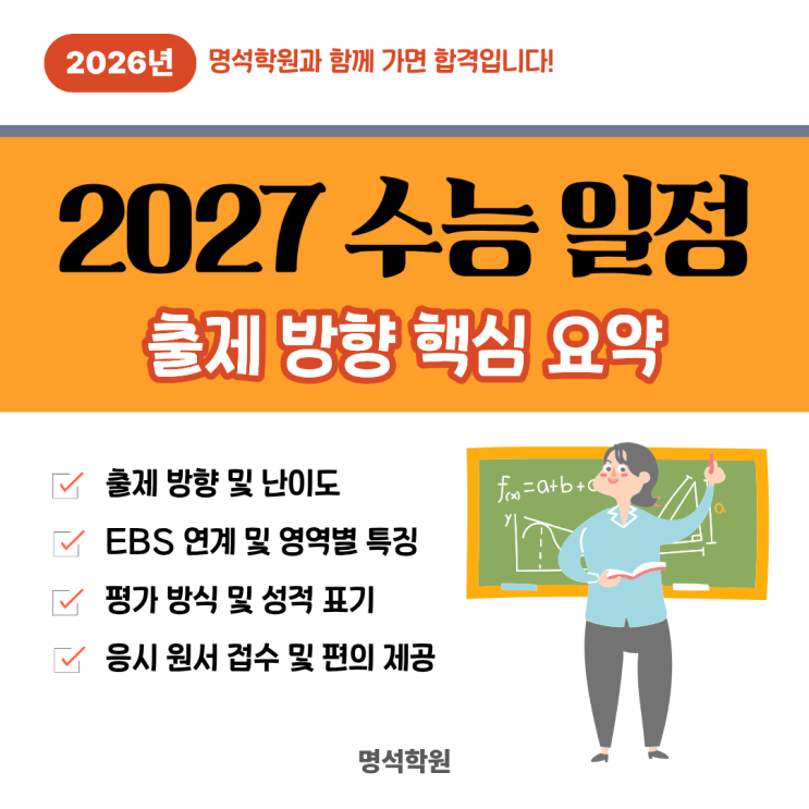 안녕하세요, 성동구 전교권의 선택! 명석학원입니다. 2027학년도 대학수학능력시험을 준비하는 수험생과 학부모님들을 위해, 최근 발표된 2027학년도 수능 시행 계획의 핵심 내용을 정리해 드립니다. 미리 일정을 확인하고 전략을 세우는 데 도움이 되길 바랍니다. 2027학년도 수능 시험일: 2026년 11월 19일(목) 가장 중요한 시험일은 2026년 11월 19일 목요일입니다. 성적 통지는 약 한 달 뒤인 2026년 12월 11일 금요일에 이루어질 예정입니다. 1. 출제 방향 및 난이도: "공정하고 안정적인 수능" 교육부와 한국교육과정평가원은 무엇보다 '공정성'과 '공교육 중심'의 출제를 강조했습니다. 교....... <img src="https://blogthumb.pstatic.net/MjAyNjA0MTVfMTcw/MDAxNzc2MjQwNTY4MzQ4.jVCElN85DtvZgyElCwDFQQ6UIUiw3ZG1puQWFx0CUocg.pwAcUKTW_kJP5W8zXXZJ2p4X4u55xSlHIZUnmr-89s8g.PNG/%C1%A6%B8%F1%C0%BB_%C0%D4%B7%C2%C7%D8%C1%D6%BC%BC%BF%E4._%2813%29.png?type=s3" />