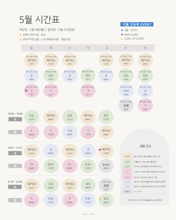 . 5월 수강신청 시작되었습니다! ▫️개강일 : 5월 4일(월) ▫️종강일 : 5월 31일(일) • 5(화) 어린이날 : 휴강 • 24(석가탄신일) ~ 25(대체공휴일) : 정상수업 문의 및 수강신청 슬튜 소식 <img src="https://blogthumb.pstatic.net/MjAyNjA0MTdfMjEy/MDAxNzc2NDEzNDk4ODI1.giMPUkFINyh4oDtfZdErXcvT02pKbgbKSeX2Fhc7Xgkg.Y1eSTWi47CwOzIbrnhSvo2wUcl7EQ0jV3gqTTeyn6pIg.PNG/IMG%A3%DF7277.PNG?type=s3" />
