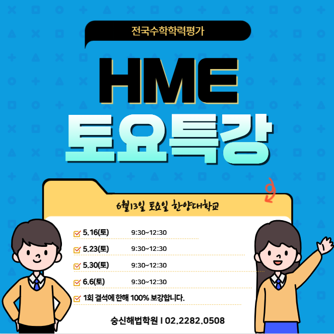 안녕하세요, 실력으로 증명하는 숭신해법학원입니다! 어느덧 1학기의 중간 지점을 지나고 있습니다. 우리 아이의 현재 수학 실력을 객관적으로 점검하고, 수학에 대한 자신감을 높여줄 수 있는 좋은 기회! 2026년 상반기 HME 전국해법수학 학력평가가 다가오고 있습니다. 숭신해법학원에서는 이번 HME 평가에서 우리 학생들이 최고의 결과를 얻을 수 있도록 [HME 토요특강반]을 개설합니다. HME 해법수학 학력평가란? HME는 지난 20여 년 동안 241만 명이 응시한 전국 최대 규모의 수학 학력평가입니다. 단순히 점수를 매기는 시험이 아니라, 다음과 같은 큰 의미가 있습니다. 객관적 실력 점검: 전국 단위에서 내 아이의 위치를 정확히 파....... <img src="https://blogthumb.pstatic.net/MjAyNjA0MjBfNTEg/MDAxNzc2NjUzNzAwOTc5.D5PBSK7_nq_xauKFn0qZ8pFy2xguihdKJSAk5Yg5gG4g.lMDjVvkrX2Fs1unpj9IIxqdt_Bkr6aFQz4Wr0MoE6Usg.PNG/1776653452911.png?type=s3" />
