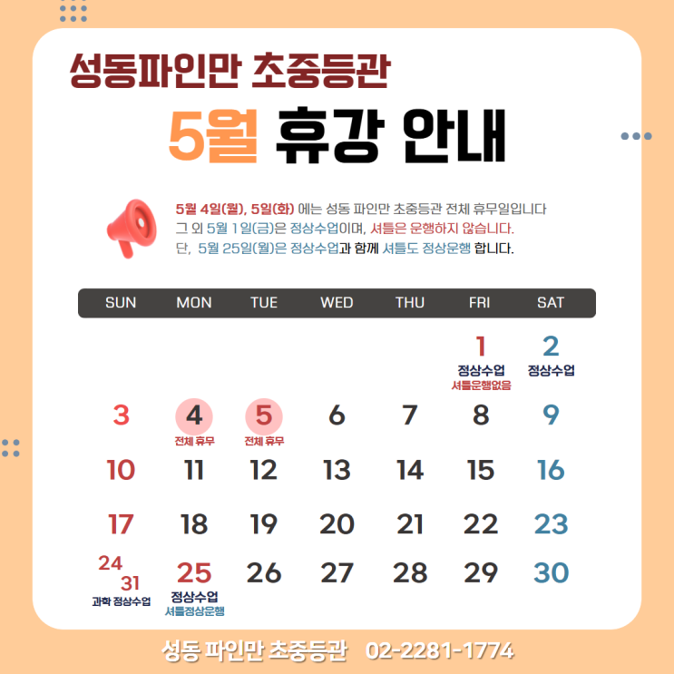 안녕하세요. 성동파인만 초중등부입니다. 가정의 달 5월을 맞아 휴강 일정 및 10시 하원 셔틀 운행 변경 사항을 안내드립니다. 공휴일과 연휴 일정으로 평소와 다른 운영이 있으니 꼭 확인 부탁드립니다. ☆ 5월 휴강 일정 안내 다음 일정은 초중등관 전체 휴강입니다. 5월 4일(월) 5월 5일(화) ★ 휴무일 조정 안내 기존 대체공휴일이었던 5월 25일 대신 5월 3일 ~ 5월 5일 연휴 기간을 활용할 수 있도록 5월 4일(월)을 휴무일로 조정하였습니다. 가정에서 아이들과 충분한 시간을 보내실 수 있도록 일정을 조정하였으니 참고 부탁드립니다. ◎ 5월 셔틀 운행 변경 일정 5월은 공휴일과 연휴 일정으로 인해 셔틀 운행이 일부 조정됩니다. ✔....... <img src="https://blogthumb.pstatic.net/MjAyNjA0MDdfMjYw/MDAxNzc1NTM5MjQ4NDY3.XokNu6PSfaE_hgzy-07WyD97IIIo2MOXy5GXfMr3Fgsg.jyN9k7LG-oG0PlSSLbkBW-sh7RjkfUbLyoNqWEIoG1Ig.PNG/KakaoTalk_20260406_164259938.png?type=s3" />